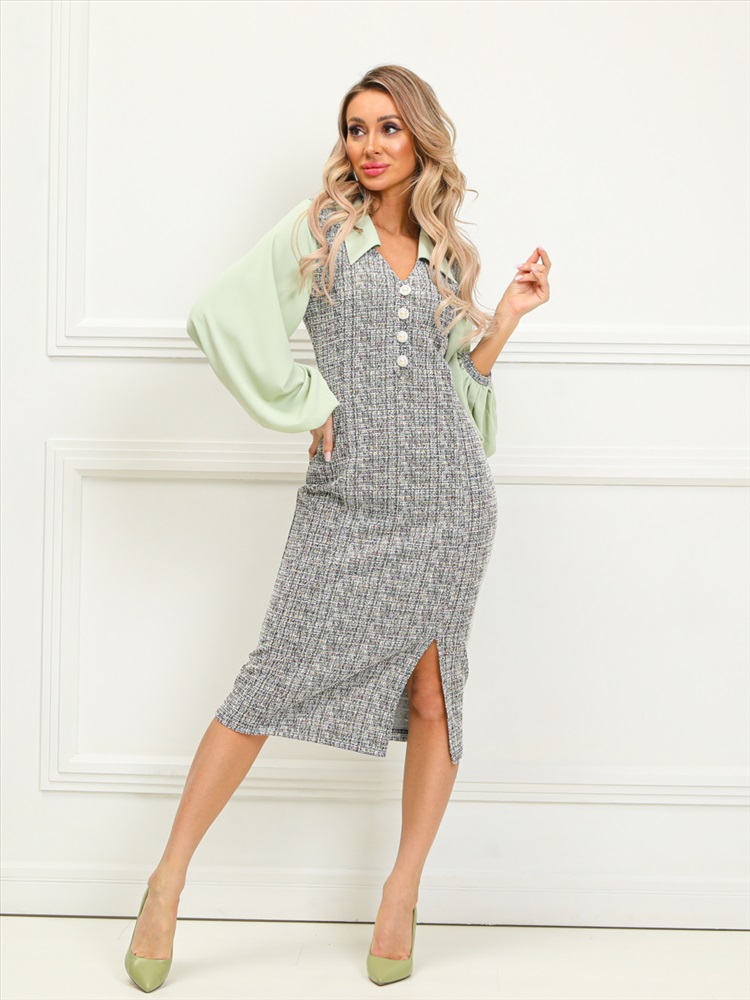 Стильное платье прилегающего силуэта из трикотажного полотна с жаккардовым переплетением мятного цвета. Фигурный вырез изделия дополнен отложным воротником. Верхняя часть переда дополнена планкой, украшенной пуговицами. Широкие втачные рукава обработаны окантовкой. Перед изделия дополнен разрезом. Ремень в комплект не входит, артикул ремня Р-79/4. Длина изделия по спинке от плечевого шва до низа изделия - см. Рост фотомодели - 170 см.