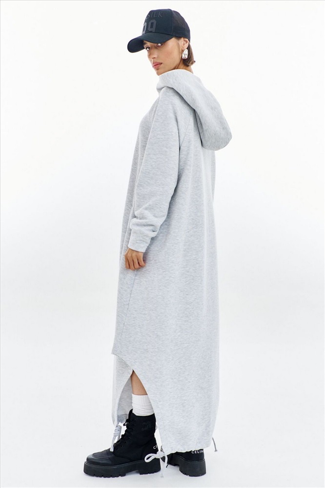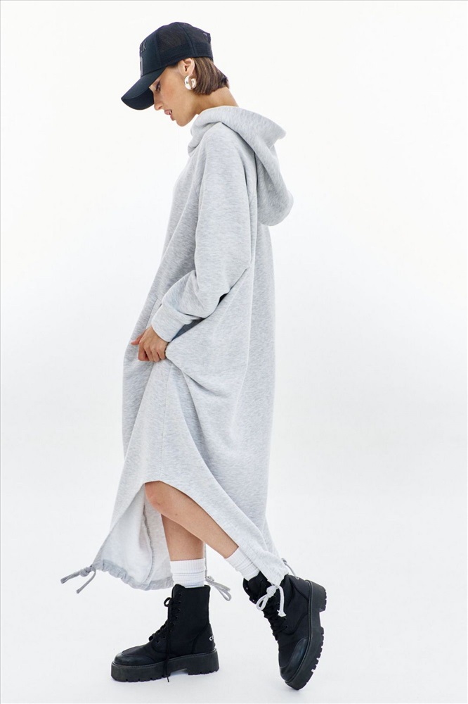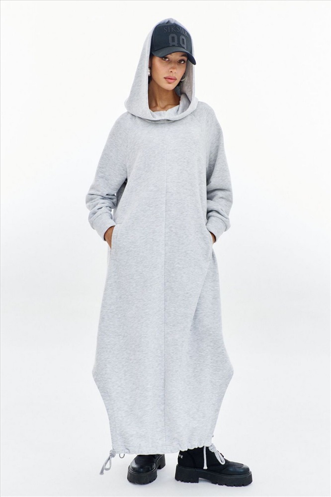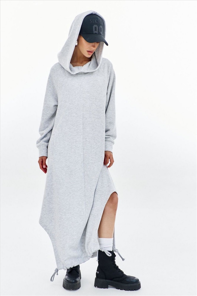 Платье свободного кроя: - горловина с двойным объемным капюшоном - в боковых швах фигурные разрезы - прорезные карманы с листочкой - рукава реглан - по низу декоративный шнур