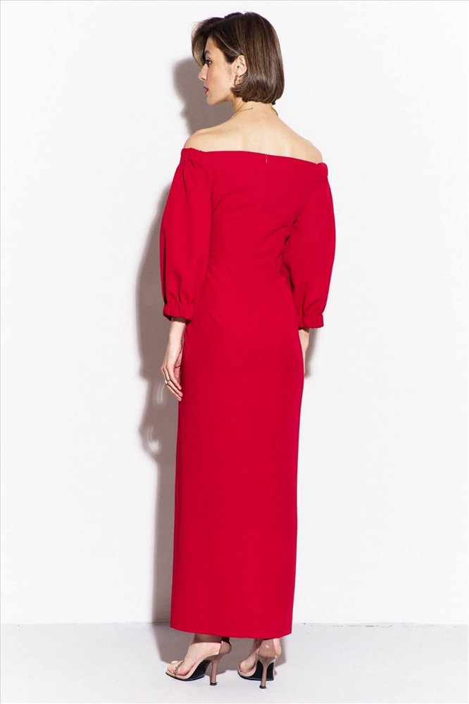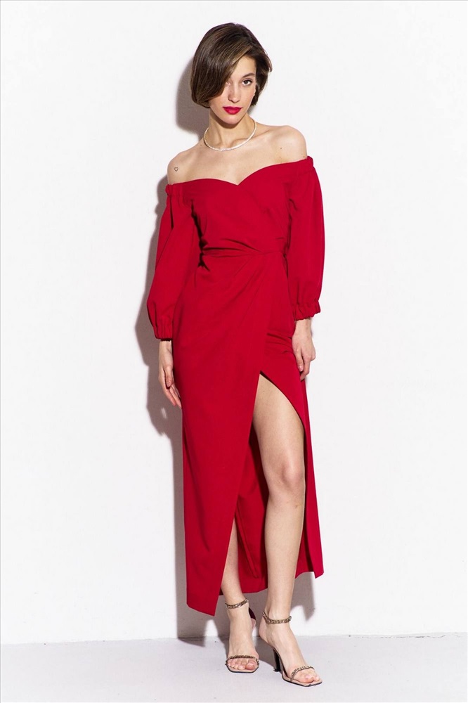 Платье полуприлегающего силуэта: -платье отрезное по линии талии -лиф спинки с талиевыми вытачками -лиф переда и юбка выполнены на запах -платье с открытыми плечами -рукава одношовные, втачные, длиной 3/4.