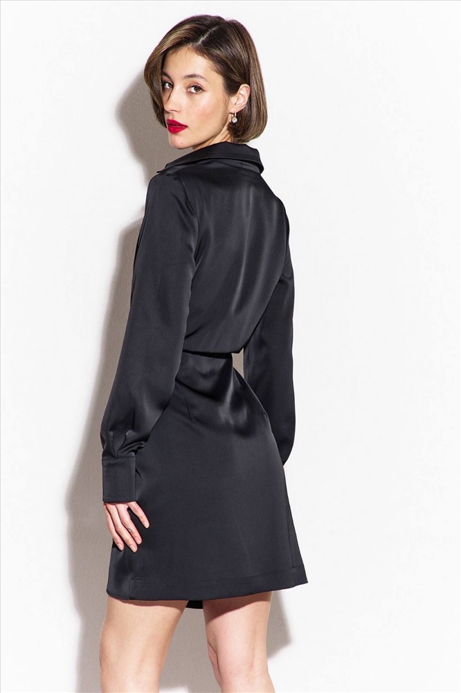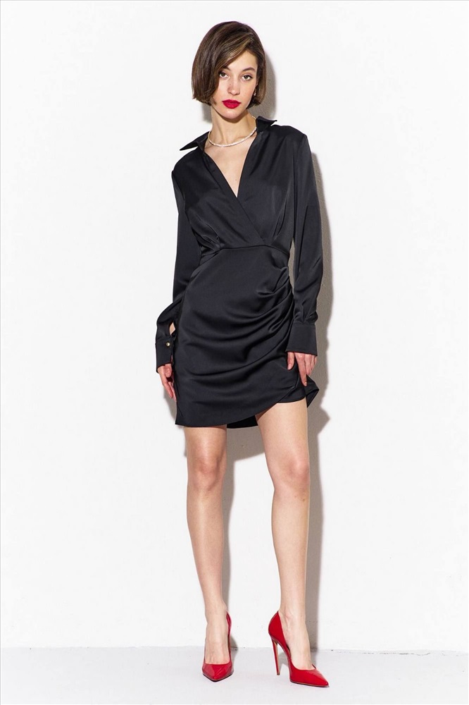 Платье полуприлегающего силуэта: - платье отрезное по линии талии - лиф переда на запах, с односторонними складками - юбка переда на запах с фигурной линией низа - рукава одношовные, втачные, длинные -горловина- рубашечный воротник на отрезной стойке - в правом боковом шве потайная молния.