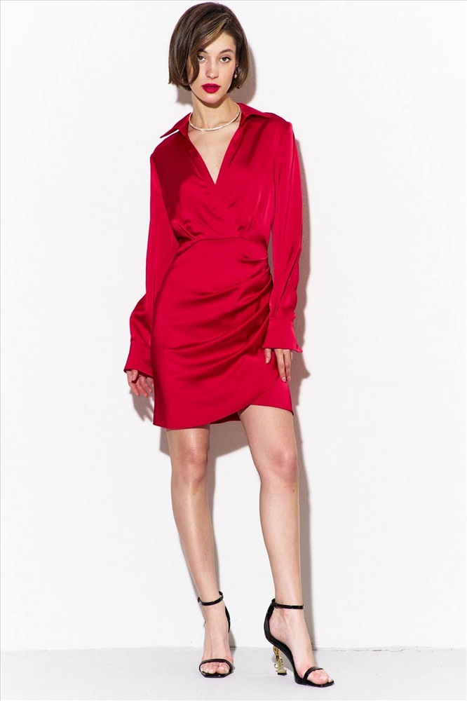 Платье полуприлегающего силуэта: - платье отрезное по линии талии - лиф переда на запах, с односторонними складками - юбка переда на запах с фигурной линией низа - рукава одношовные, втачные, длинные -горловина- рубашечный воротник на отрезной стойке - в правом боковом шве потайная молния.