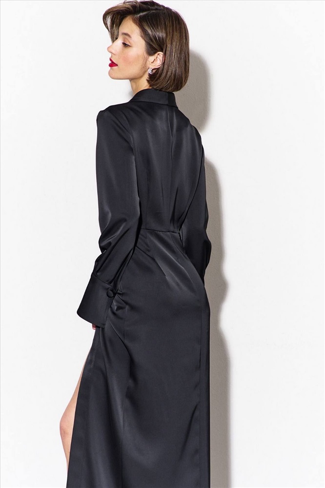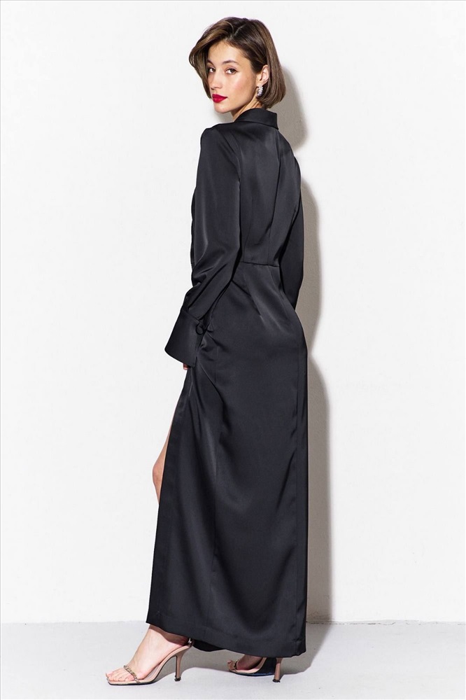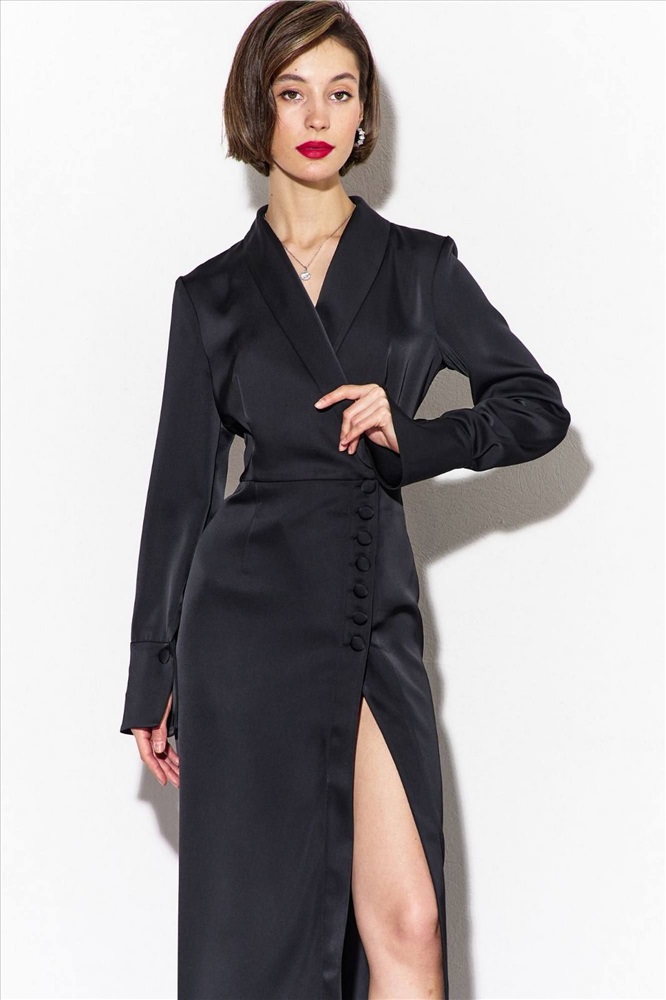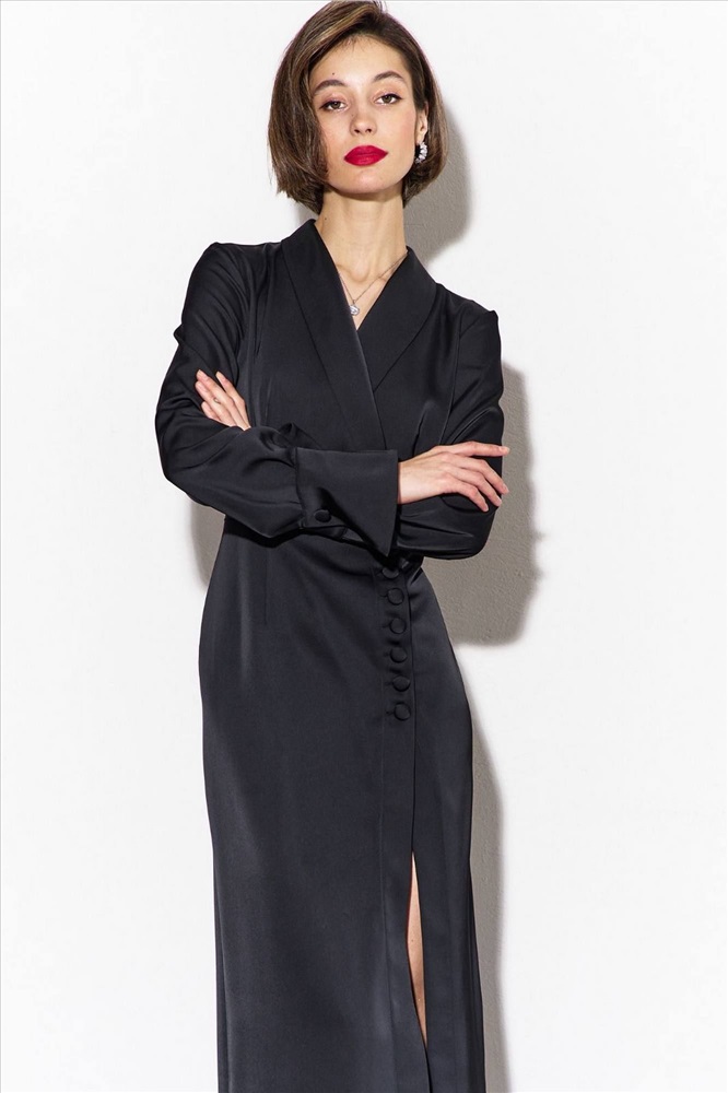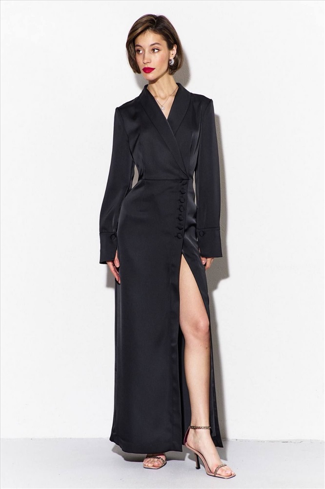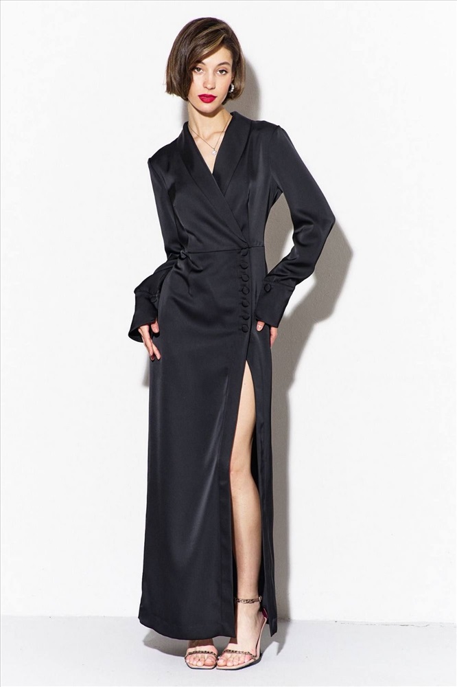 Платье полуприлегающего силуэта: -длина макси - платье выполнено на запах -по горловине воротник «шаль» -рукава одношовные, втачные, длинные -застежка по переду на петли и пуговицы.