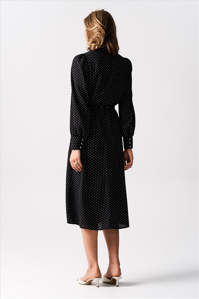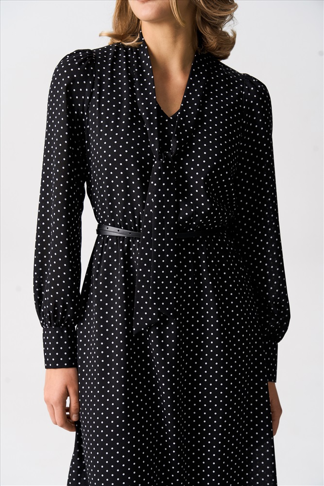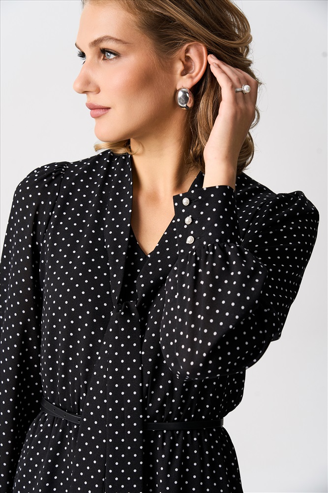 Состав: 100% ПЭ Длина: 120 см. Цветовая гамма: Черный/горох Силуэт: Свободный Принт: Да Коллекция: Новый год 2026 Платье из шифона длины миди. Модель отрезная по линии талии. Линия талии поддерживается узкой резиной. Горловина оформлена воротником-стойкой, переходящей в галстук. Рукава длинные со сборкой по окату, высокие манжеты, застегивающиеся на петли и пуговицы. Комментарии к товару