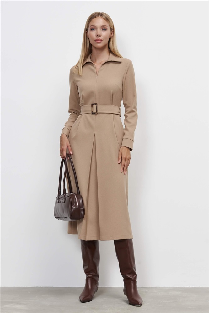 Состав: 55% Вискоза 40% Полиэстер 5% Эластан Длина: 122 см. Цветовая гамма: Бежевый Силуэт: Полуприлегающий Принт: Нет Коллекция: Осень #4 Платье в ретро-стиле из костюмного полотна. Модель полуприлегающего силуэта, отрезная по линии талии со встречной складкой. По переду отложной воротник со стойкой. Застежка потайная молния по переду. Комментарии к товару