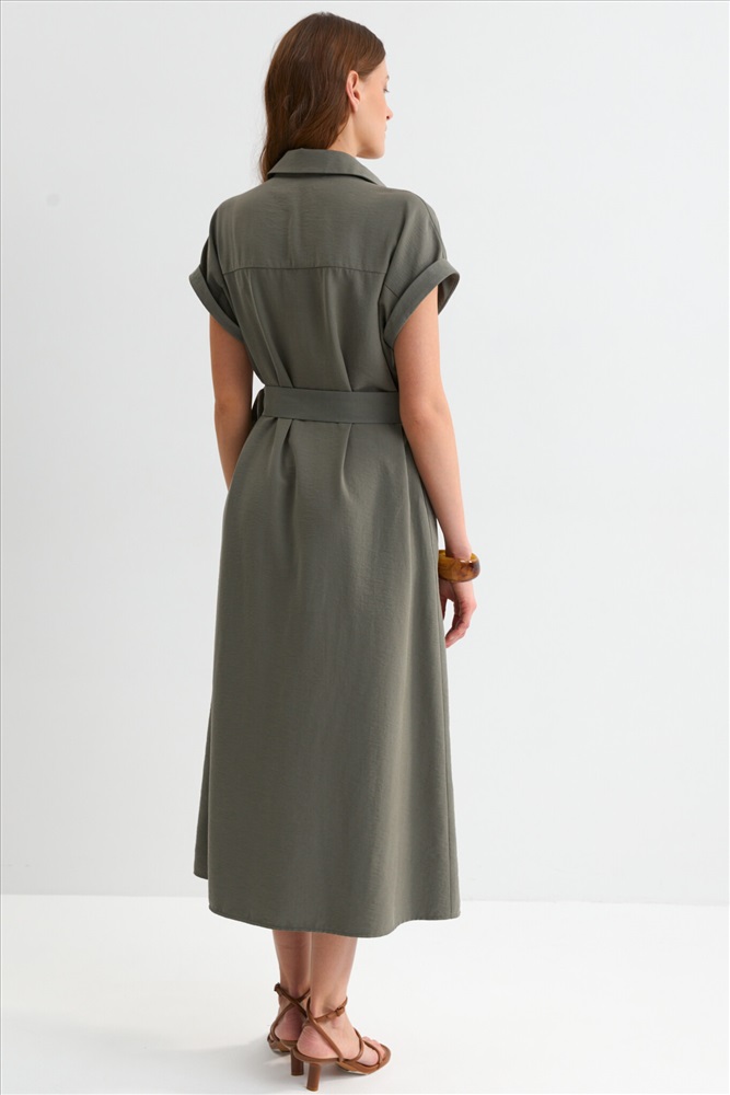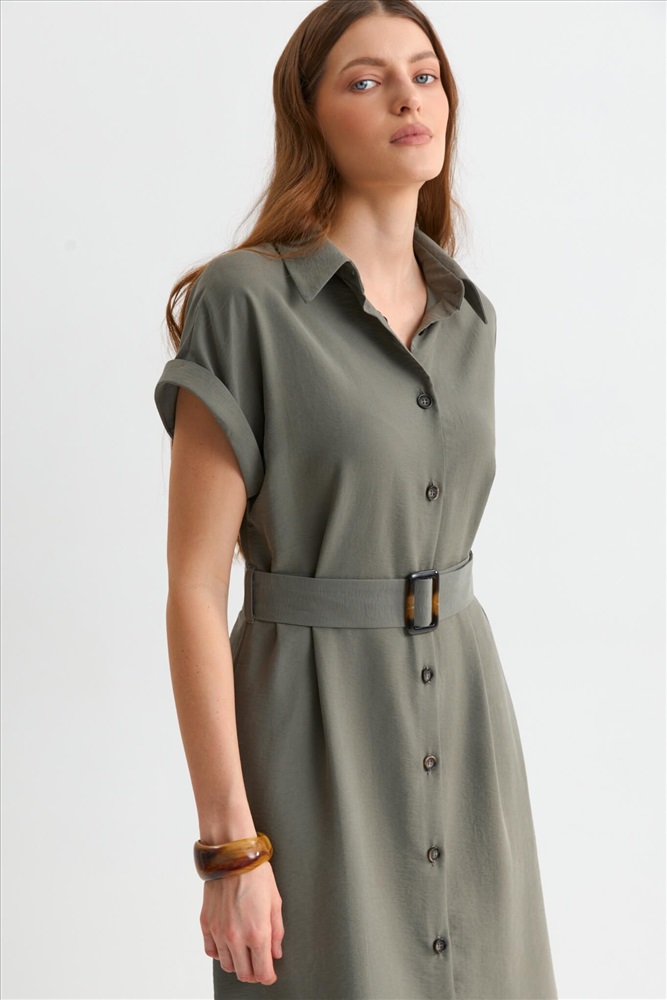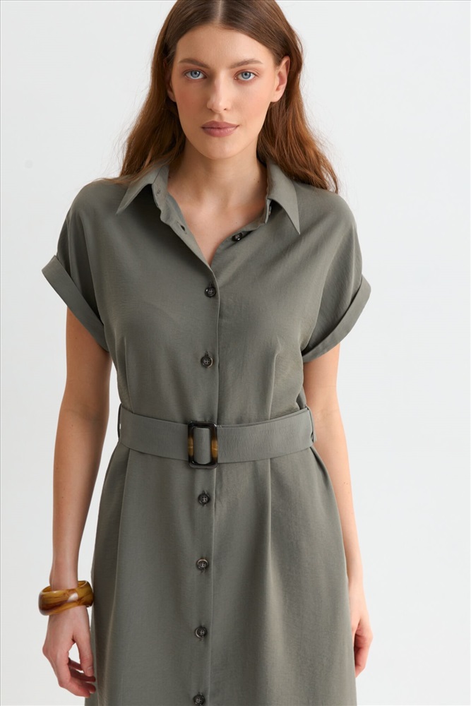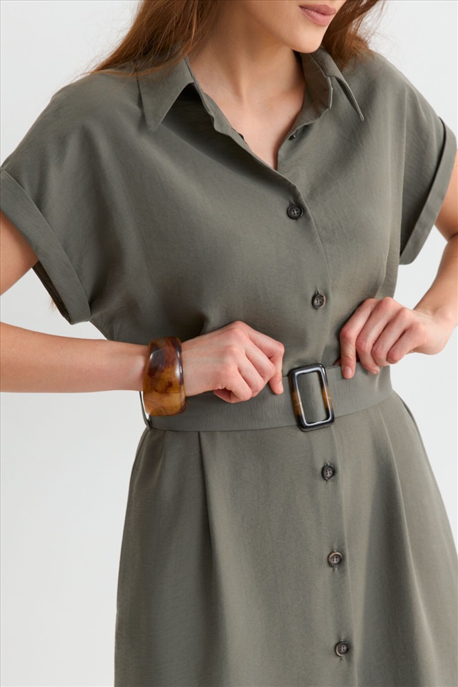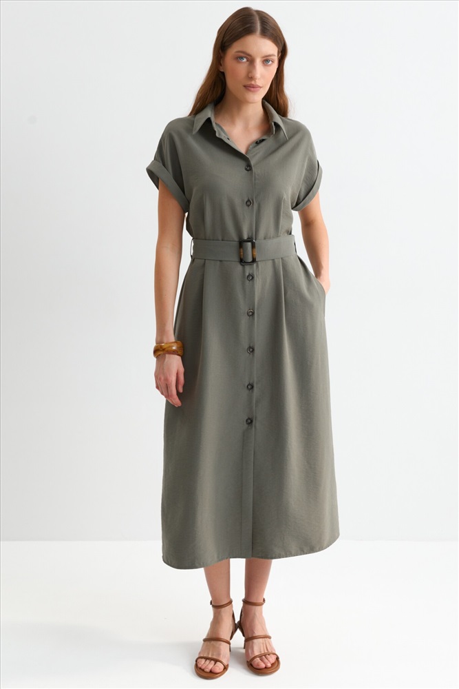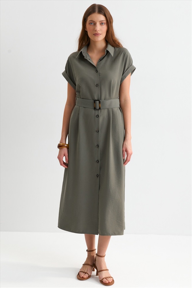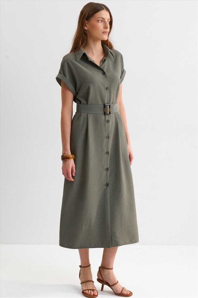 Платье длины миди из лиоцелла. Модель А-силуэта. Воротник отложной со стойкой. Рукав спущенный с манжетой. По переду застежка на петли и пуговицы. По спинке кокетка. Карманы в боковых швах. В комплекте пояс с пряжкой.