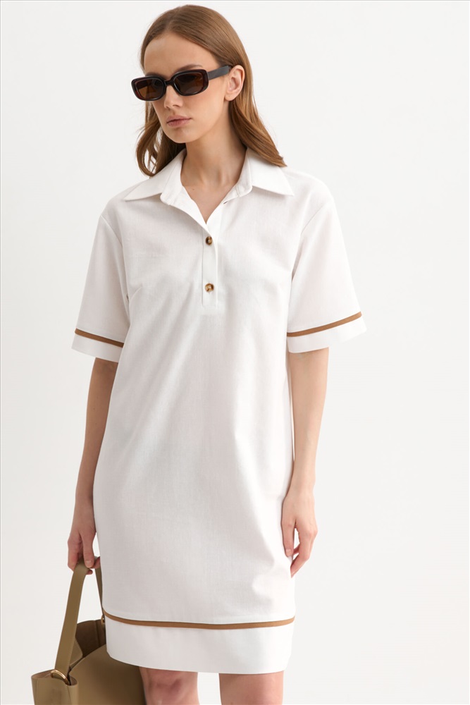 Платье длины мини из льняного полотна с контрастной отделкой. Модель прямого силуэта. Рубашечный воротник. Короткий рукав, слегка спущенное плечо. Низ рукава и изделия отделаны контрастным кантом.