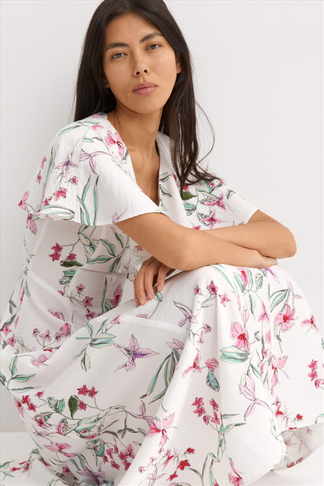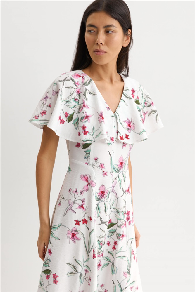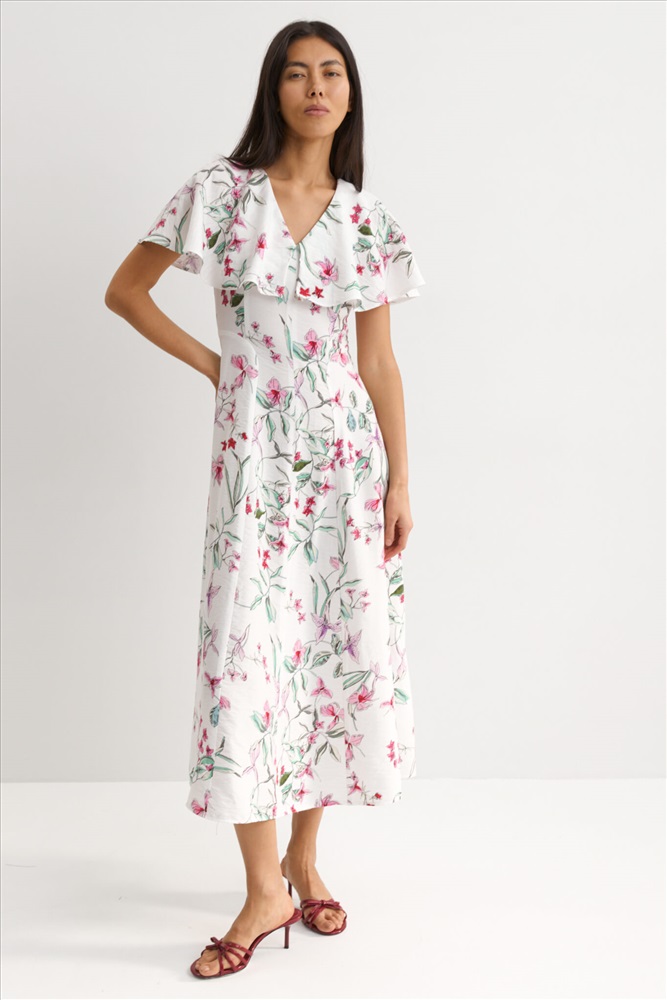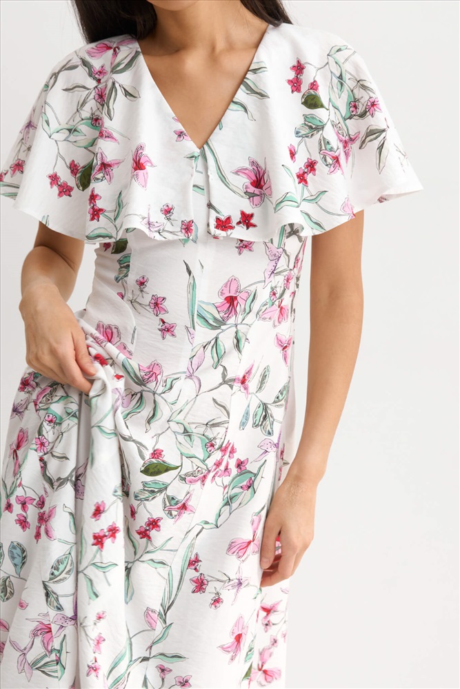 Состав: 85% Вискоза 15% Нейлон Длина: 130 см. Цветовая гамма: Молочный/цветы Силуэт: Полуприлегающий Принт: Да Коллекция: Лето #4 Женственное платье с флористическим принтом из фактурной вискозы. Модель полуприлегающего силуэта. V-образный вырез горловины оформлен пелериной. По переду и спинке фигурные рельефные швы. Застежка на потайную молнию в боковом шве. Комментарии к товару