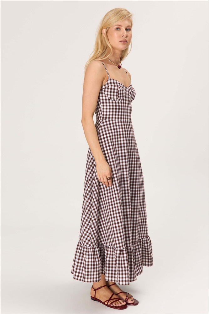 Состав: 100% Хлопок Длина: 130 см. Цветовая гамма: Клетка шоколад/молочный Силуэт: Полуприлегающий Принт: Да Коллекция: Лето #5 Сарафан длины миди из мягккого хлопка. Модель полуприлегающего силуэта с отрезной линией талии. По переду лиф с чашками. По спинке застежка на потайную молнию. Бретели с регуляторами. По низу изделия акцентный волан со сборкой. Изделие на хлопковом подкладе. Комментарии к товару