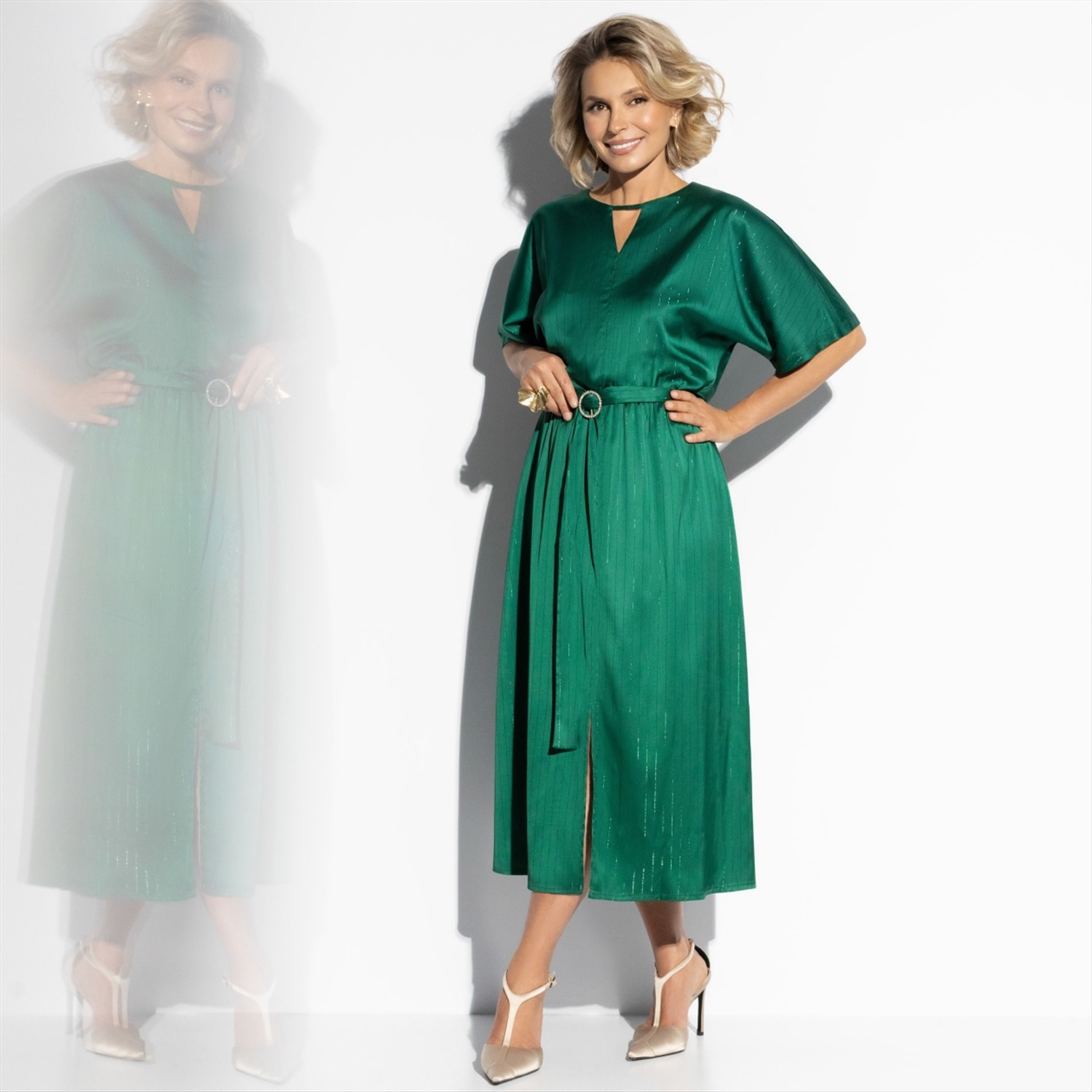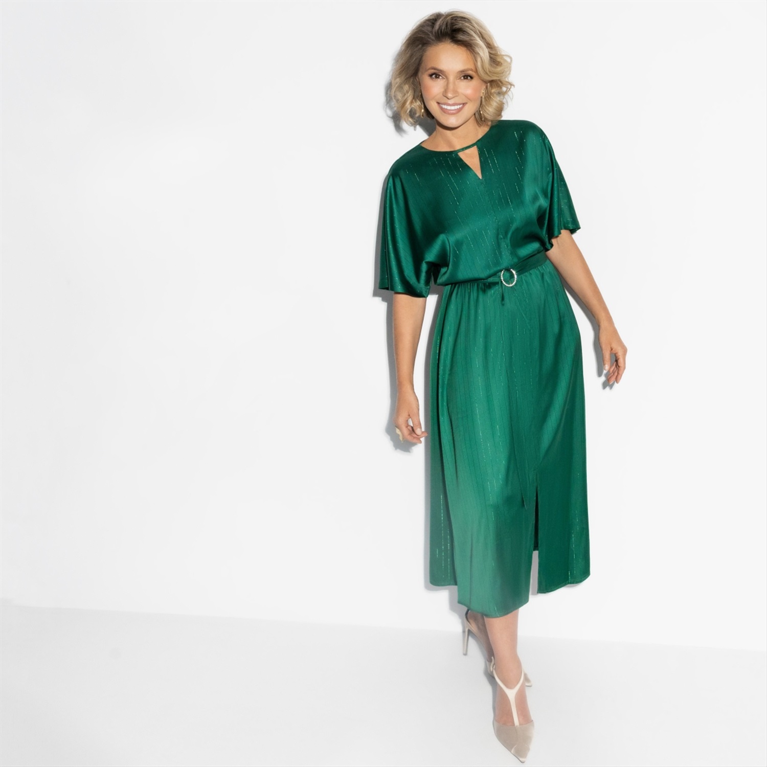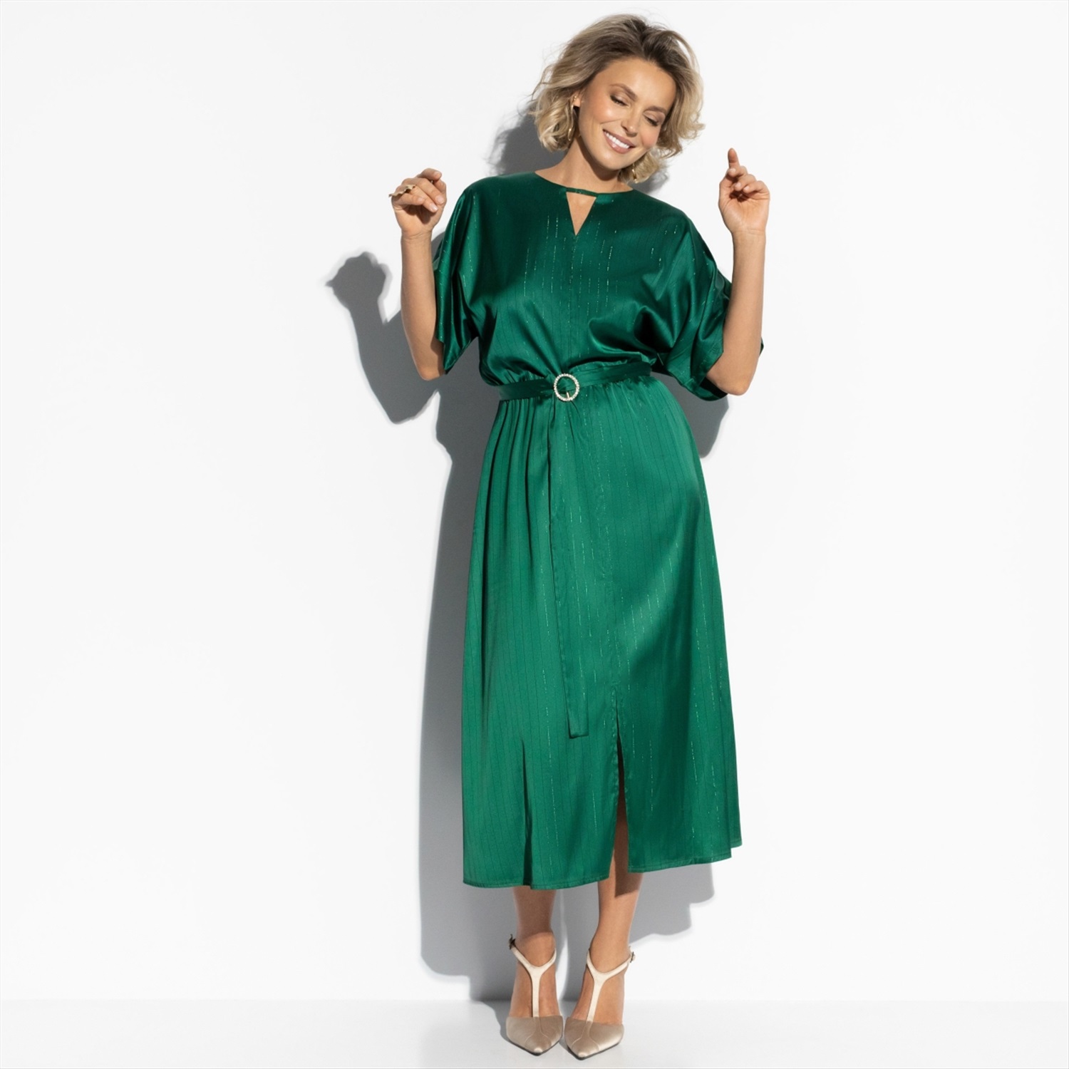 Говорят, изумруд притягивает удачу и исполняет самые заветные желания. В этом платье ЧАРУТТИ чувствуешь себя немного волшебницей, окутывая всех чарами своего обаяния. Пусть этот наряд станет твоим талисманом в Новом Году! Миди-платье из струящейся ткани изумрудного оттенка. Свободный верх, декоративный пояс на талии, эффектный разрез спереди. Ткань с легким блеском. Идеально для праздничных вечеров, когда хочется ловить взгляды. Комментарии к товару