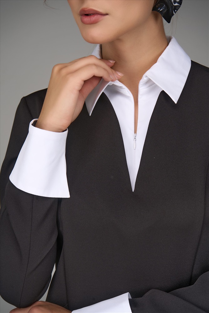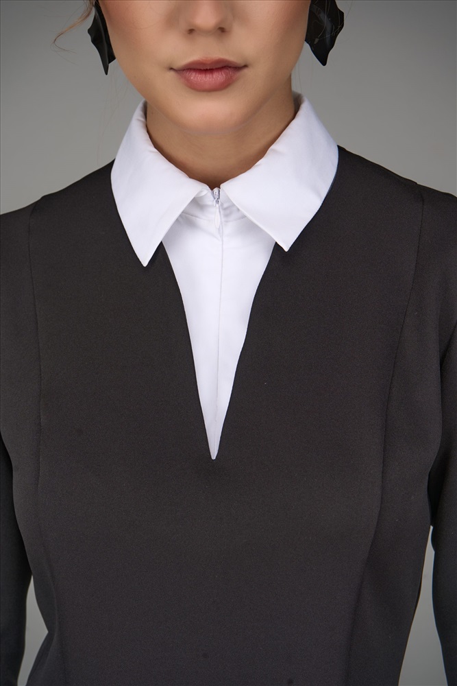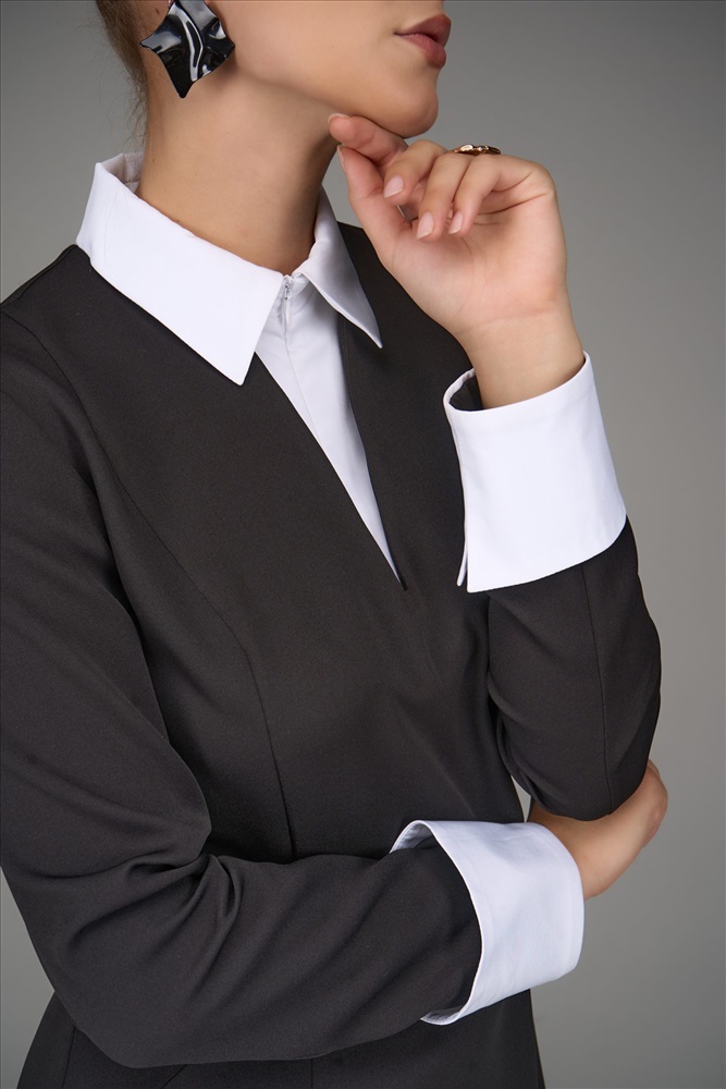 Сдержанное платье приталенного силуэта с длинными рукавами и прямой юбкой с аккуратными складками спереди. Модель выполнена в деловом стиле из плотной однотонной ткани и дополнена контрастным треугольным воротником и и отложными манжетами.