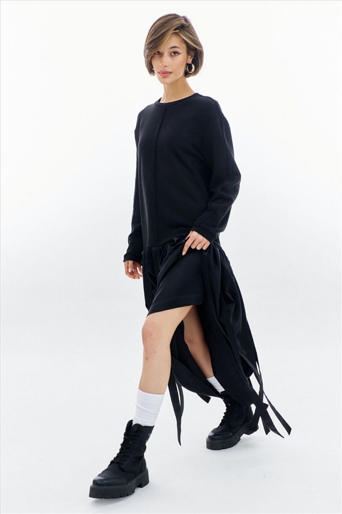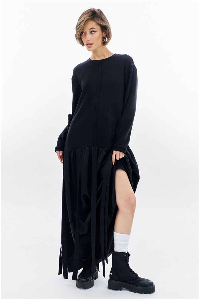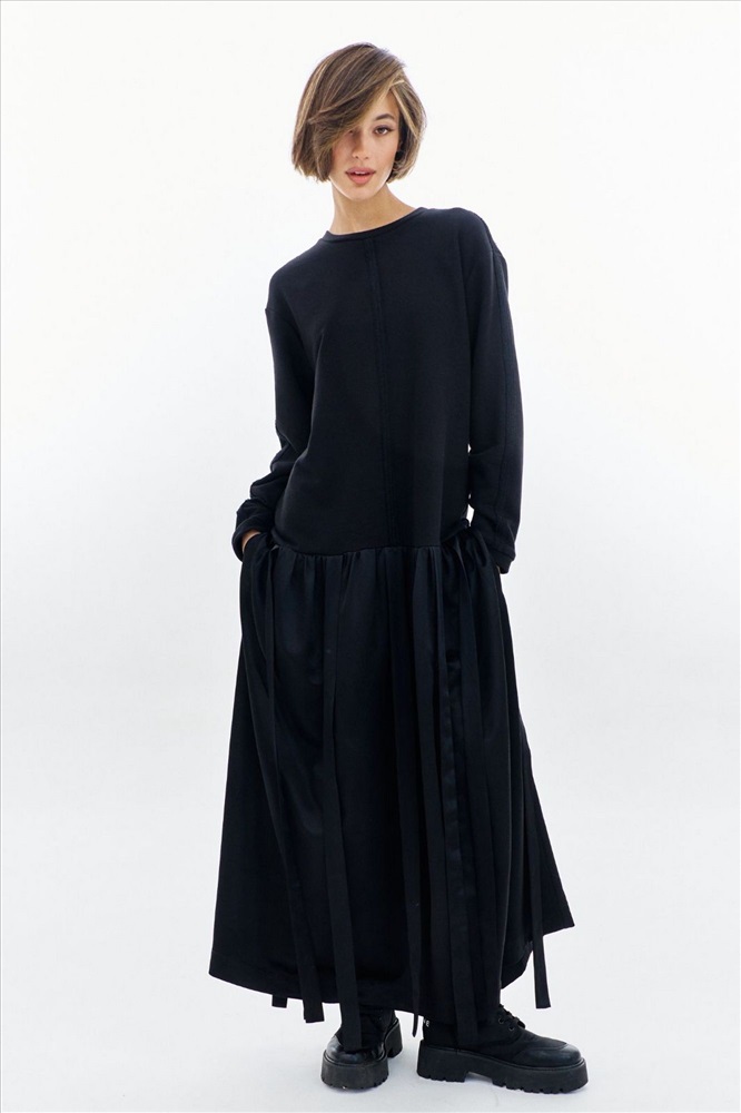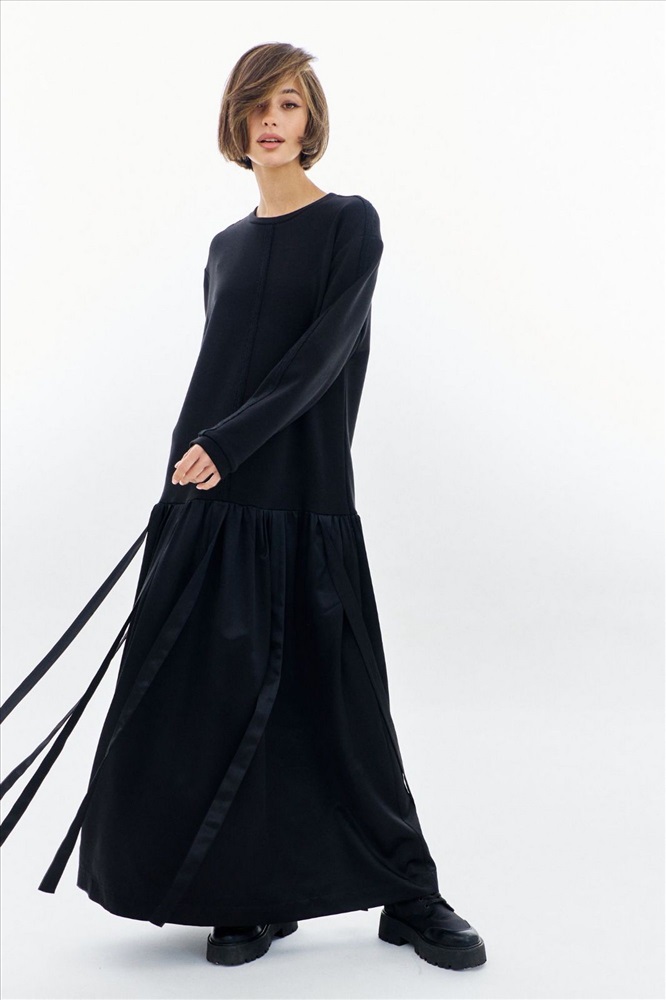 Платье свободного кроя: -округлая горловина -верхняя часть платья из футера с открытыми швами -рукава втачные, длинные -юбка платья со сборкой и декоративными лентами -в боковых швах карманы .