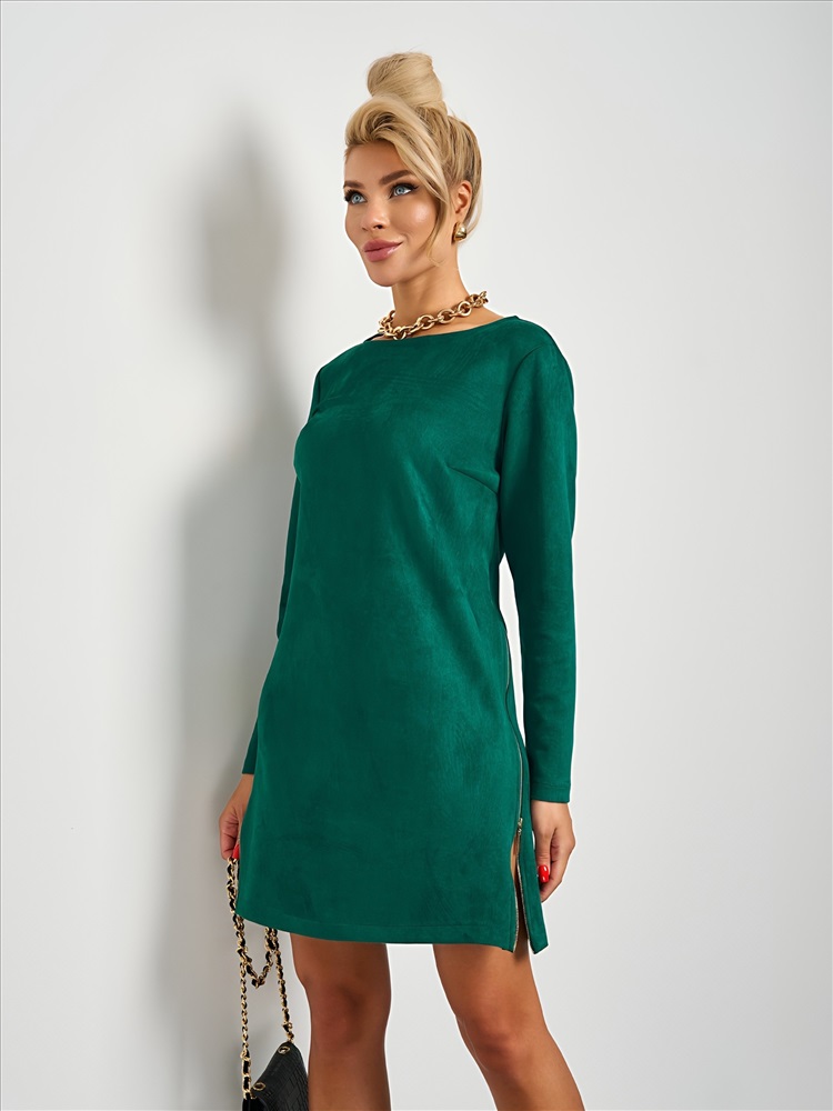 Платье зелёное из искусственной замши от компании Jetty. Модель А-силуэта с вырезом горловины лодочка. Длинный втачной рукав. Спинка со средним швом. В боковых швах - разрез на молнии. Отличный выбор для создания элегантного образа., Оттенок цвета может незначительно отличаться от фото., Размер модели: 44., Рост модели: 175 см., Состав:, Полиэстер 95%, Эластан 5%, Тип ткани:, Искусственная замша