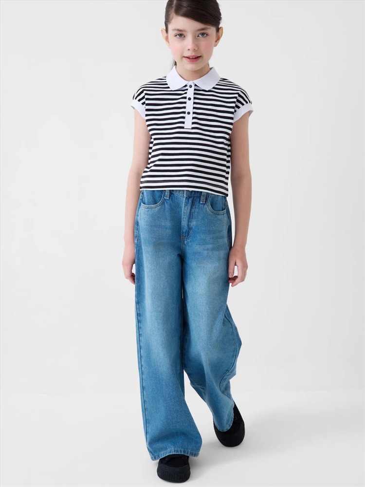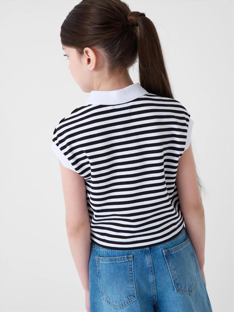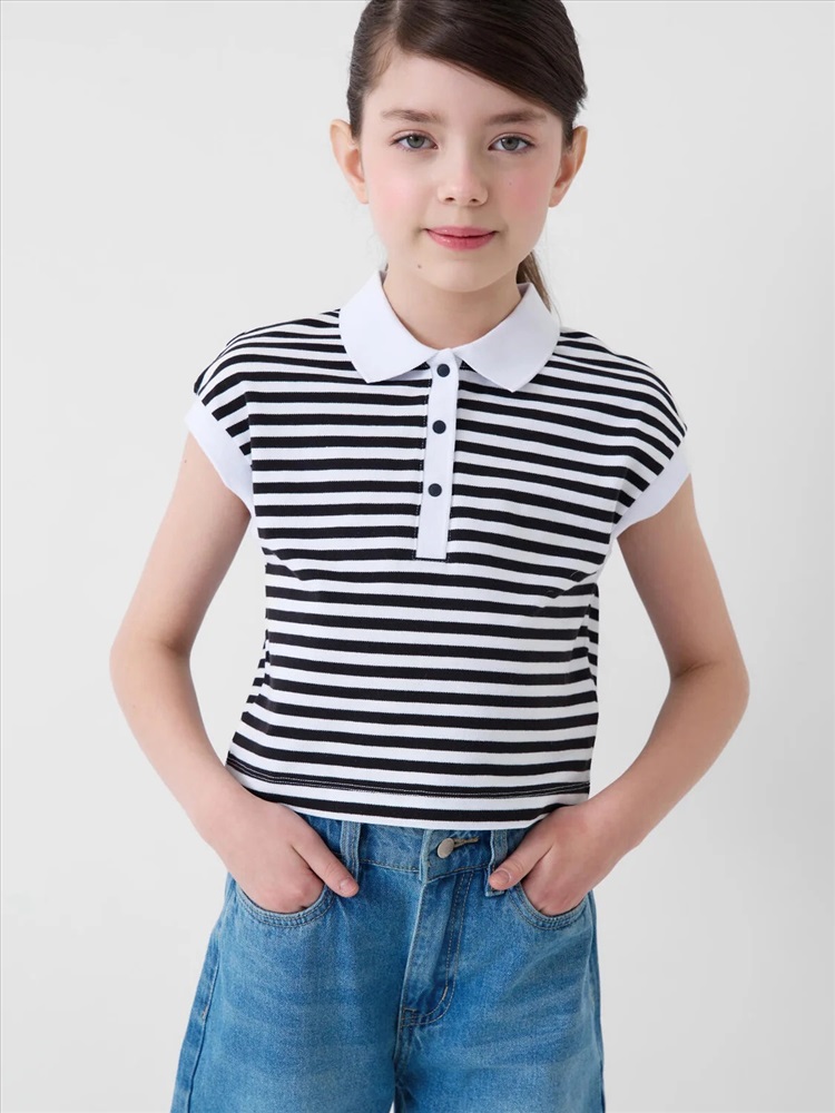 Укороченная футболка-поло в полоску для девочки подростка. Модель прямого кроя, с коротким рукавом, выполненная из хлопкового трикотажа пике. Спереди — застежка на три кнопки. Длина изделия укороченная — до уровня талии.