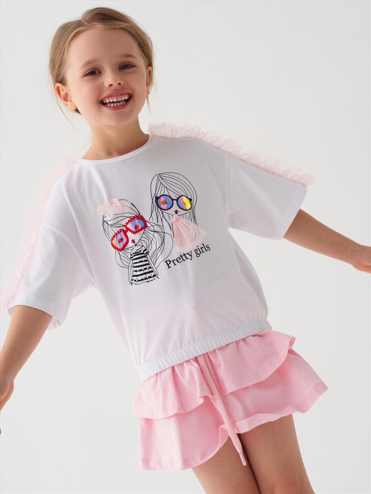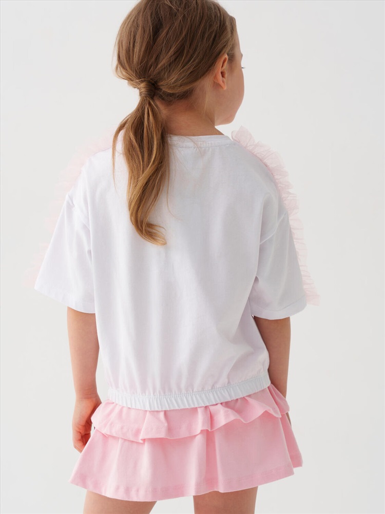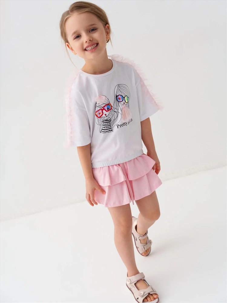 Детская футболка для девочки. Модель свободного кроя, выполнена из эластичного хлопкового трикотажа джерси. Спереди расположен крупный принт. Горловина круглая. Рукава с рюшами из сетки. Низ изделия на эластичной резинке.