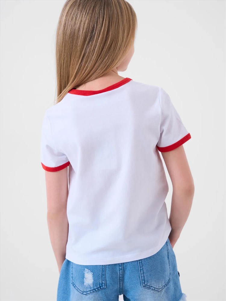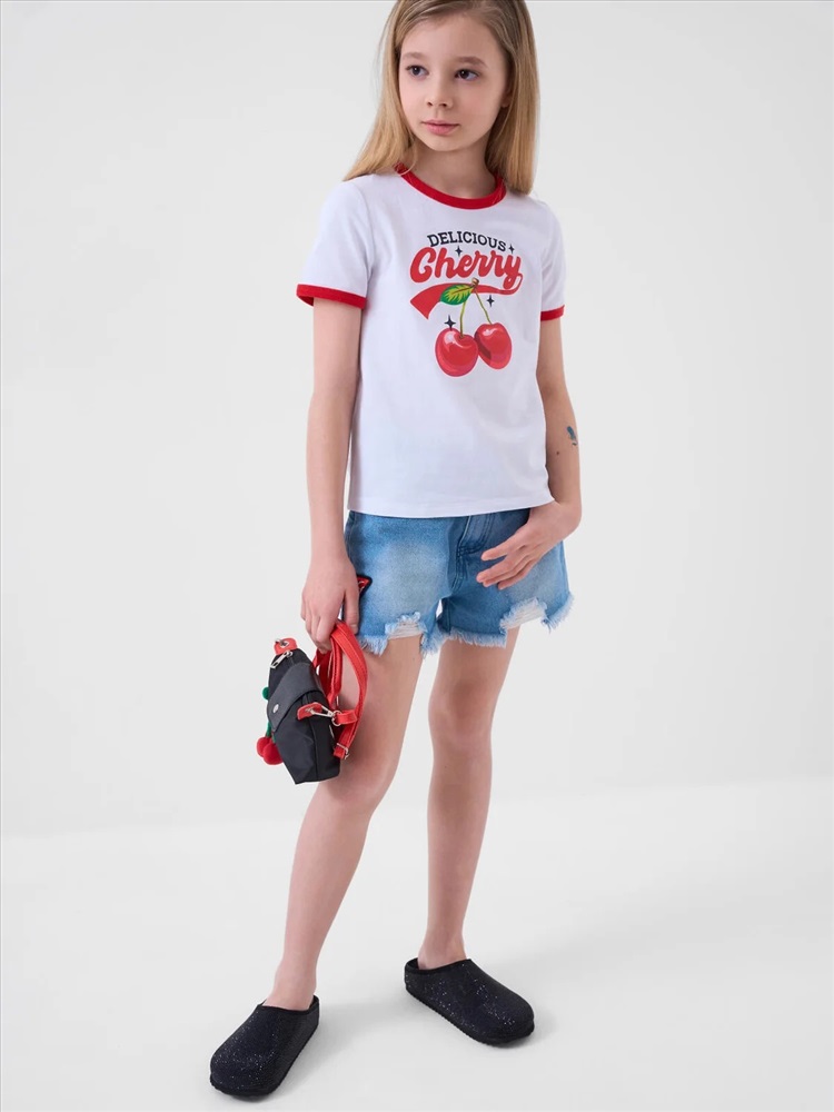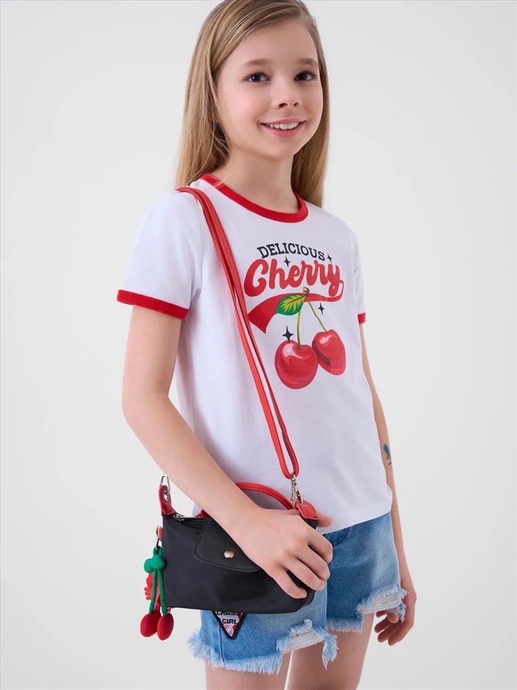 Российский размер: 128 Рост: 128 Возраст: 8 Обхват шеи: 29,5/28 Артикул поставщика: 12621647 Состав: 95% хлопок, 5% эластан Год: 2026 Футболка для девочки подростка. Модель прямого кроя, выполнена из эластичного хлопкового трикотажа джерси. На груди расположен крупный принт с изображением вишен. Горловина круглая. Комментарии к товару