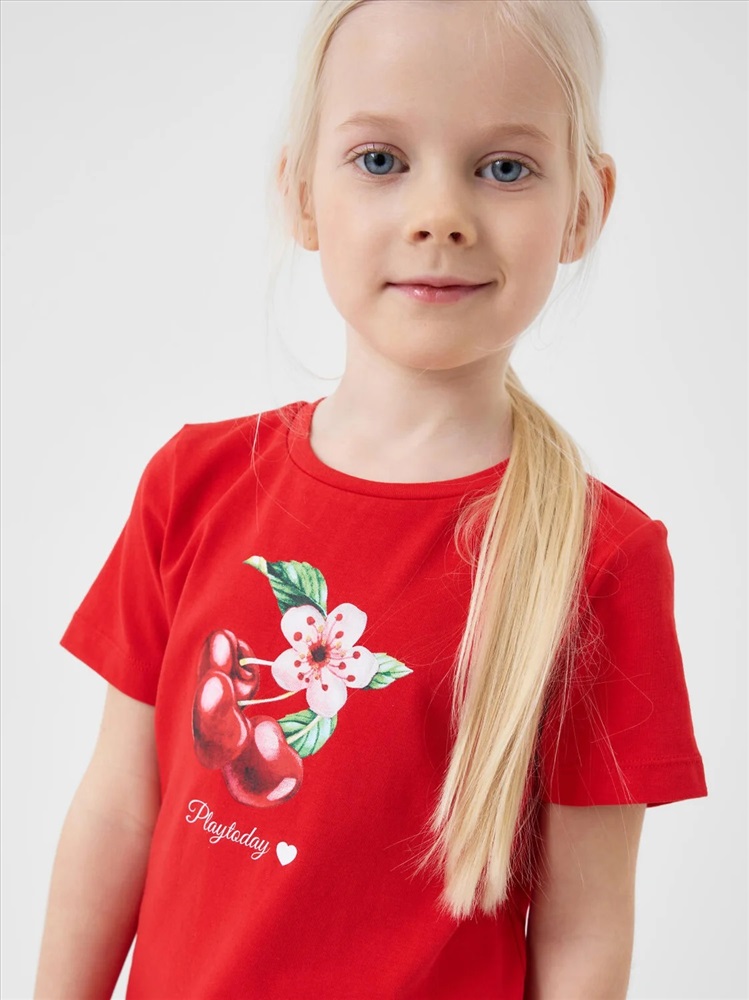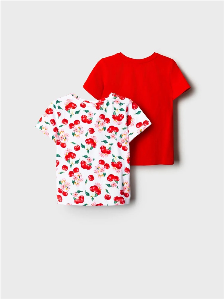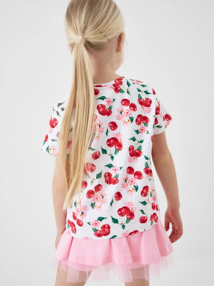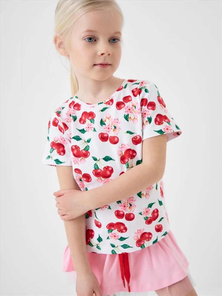 Набор детских футболок для девочки. Комплект из 2 футболок выполнен из хлопкового трикотажа джерси. Яркие принты с вишнями, листами и цветами.