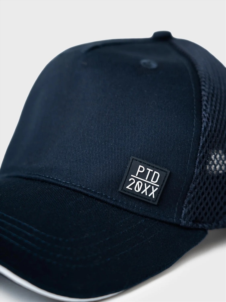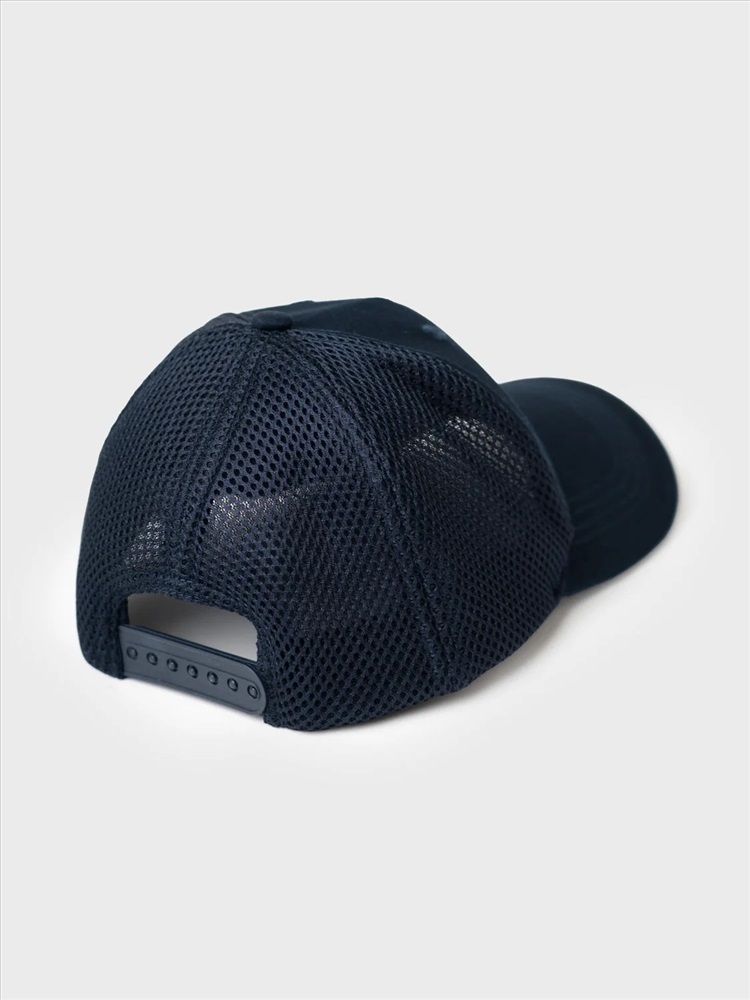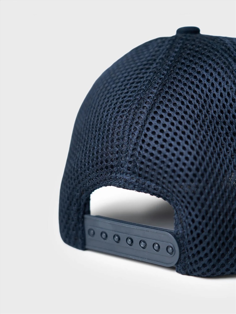 Бейсболка для мальчика подростка. Модель с изогнутым козырьком, выполненная из комбинации плотной хлопковой ткани и сетки. Передняя часть — темно-синяя, задняя — из черной сетки для лучшей вентиляции. На лицевой стороне — небольшая нашивка, а сбоку — декоративная лента с надписью. Сзади есть пластиковая застежка на кнопках, позволяющая регулировать размер.