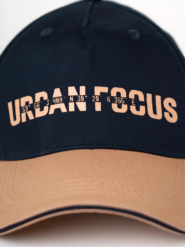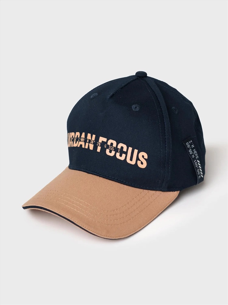 Бейсболка для мальчика подростка. Изготовлена из плотного хлопкового тёмно-синего текстиля с контрастным бежевым козырьком. На передней части расположен крупный принт. Козырек изогнутый. Сбоку — вертикальный ярлык. Застежка сзади пластиковая на кнопках, регулируется по объему. На макушке — обтянутая пуговка, имеются вентиляционные люверсы.