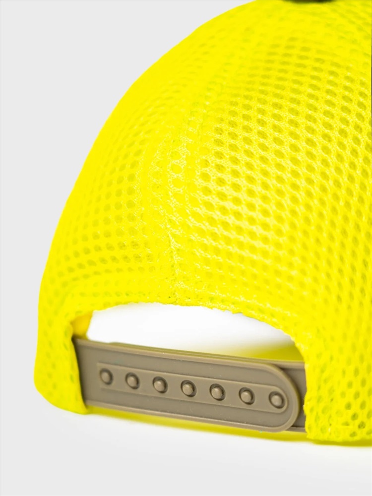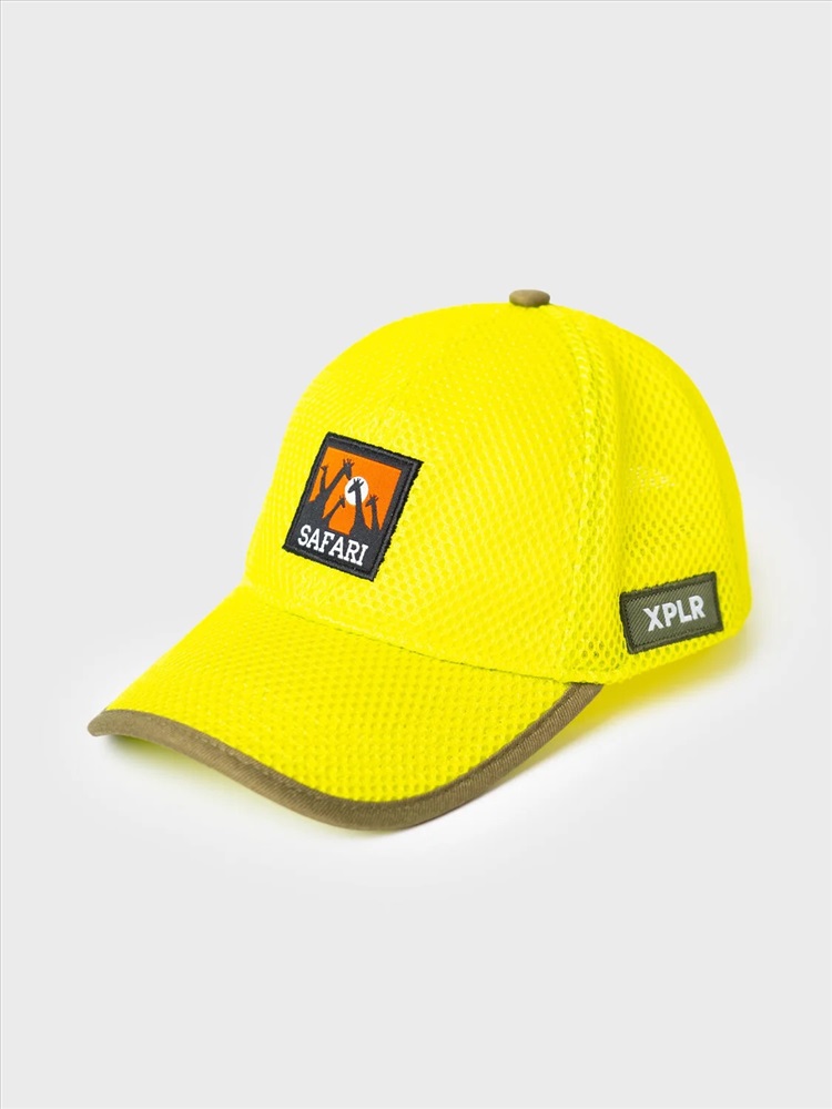 Детская бейсболка для мальчика. Модель выполнена из легкой дышащей сетки ярко-жёлтого цвета. Классическая форма с изогнутым козырьком и регулируемой застежкой на копках сзади. Спереди размещён вышитый шеврон с изображением сафари, а сбоку — тканевая нашивка.