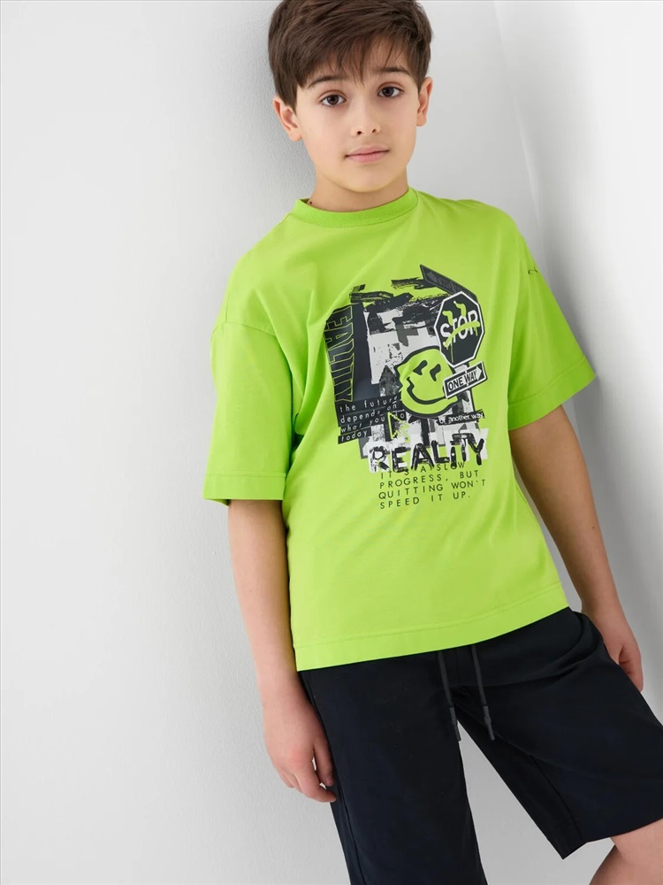 Костюм для мальчика подростка. Состоит из футболки и шорт. Выполнен из хлопкового трикотажа. Футболка оверсайз, с коротким рукавом. Яркий принт в стиле граффити. Шорты свободные, с эластичным поясом и шнурком для регулировки посадки. По бокам расположены карманы.