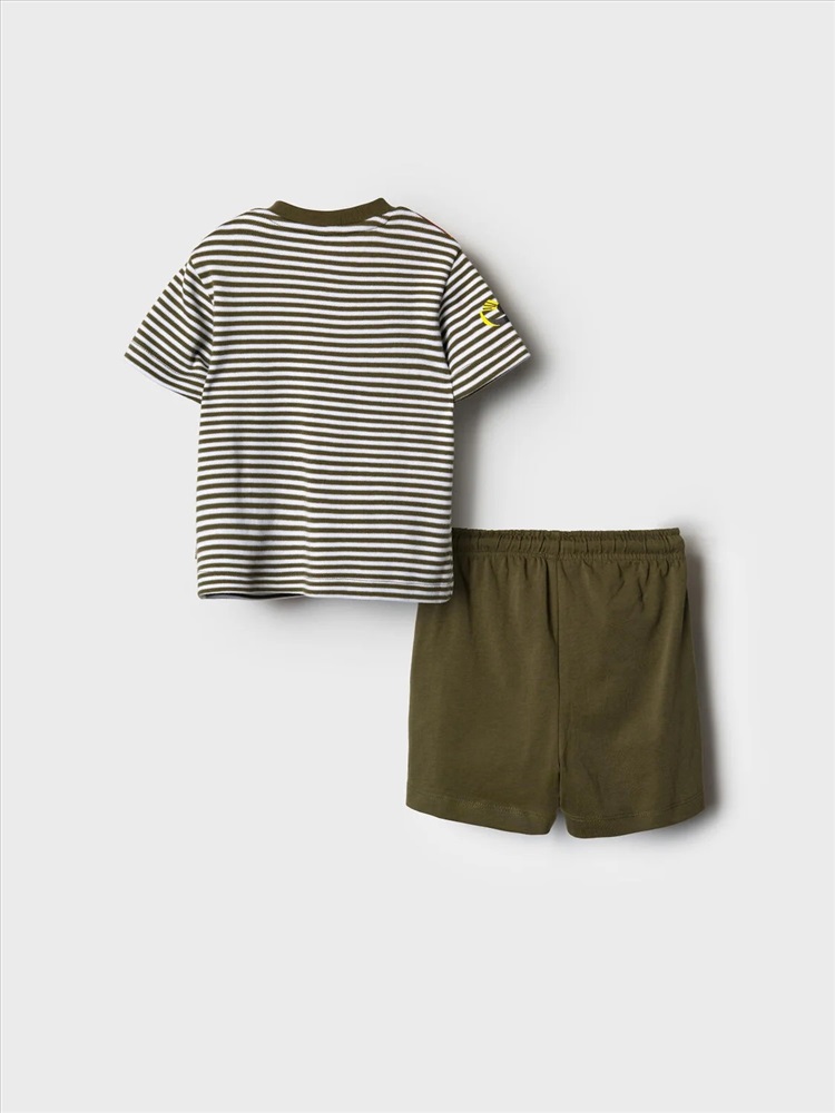Детский костюм для мальчика. Состоит из футболки и шорт. Выполнен из хлопкового трикотажа. Футболка прямого кроя, с коротким рукавом. На плече застежка на кнопки для удобного переодевания. Яркий принт и нашивки. Шорты свободные, с эластичным поясом и шнурком для регулировки посадки. По бокам расположены карманы.