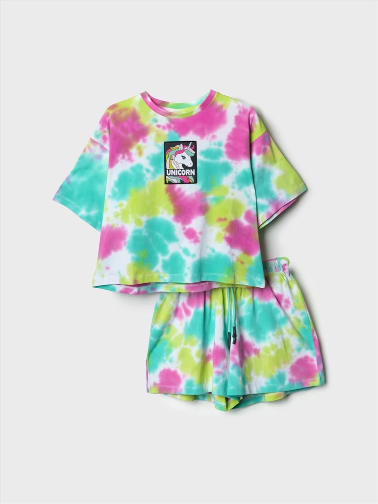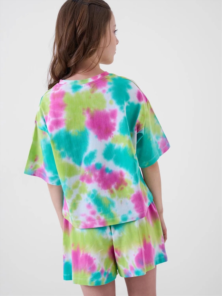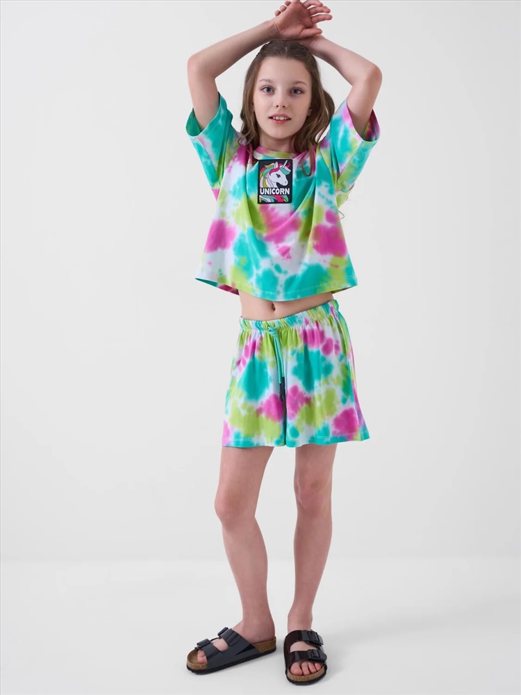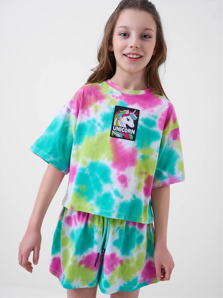 Российский размер: 128 Рост: 128 Возраст: 8 Обхват шеи: 29,5/28 Артикул поставщика: 12621274 Состав: 95% хлопок, 5% эластан Год: 2026 Стильный костюм для девочки подростка. Состоит из футболки с коротким рукавом и шорт. Укороченная футболка оверсайз с принтом. Шорты свободные, короткие, хорошо сидят на талии благодаря эластичному поясу и регулирующему шнурку. Удобные боковые карманы. Комментарии к товару