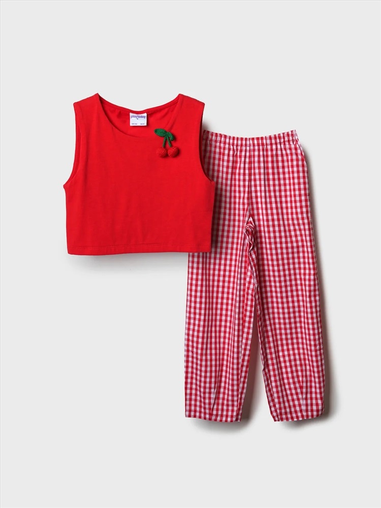 Российский размер: 128 Рост: 128 Возраст: 8 Обхват шеи: 29,5/28 Артикул поставщика: 12621571 Состав: Футболка- 95% хлопок, 5% эластан, Брюки- 100% хлопок Год: 2026 Комплект для девочки подростка. Базовый топ из хлопкового трикотажа в рубчик, декорирован объемными вишенками. Широкие брюки на резинке. Удобные боковые карманы. Комментарии к товару