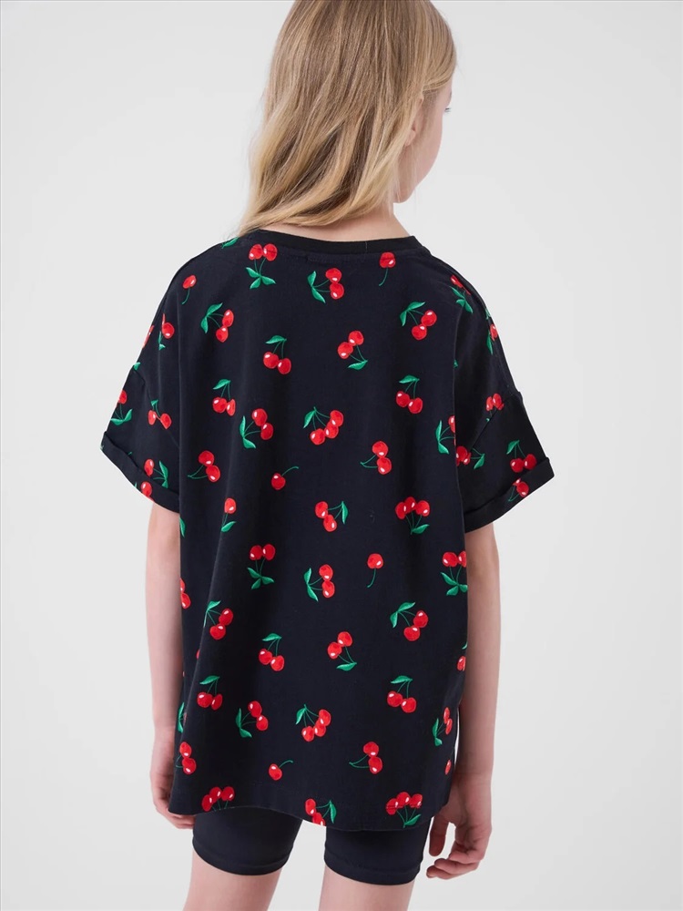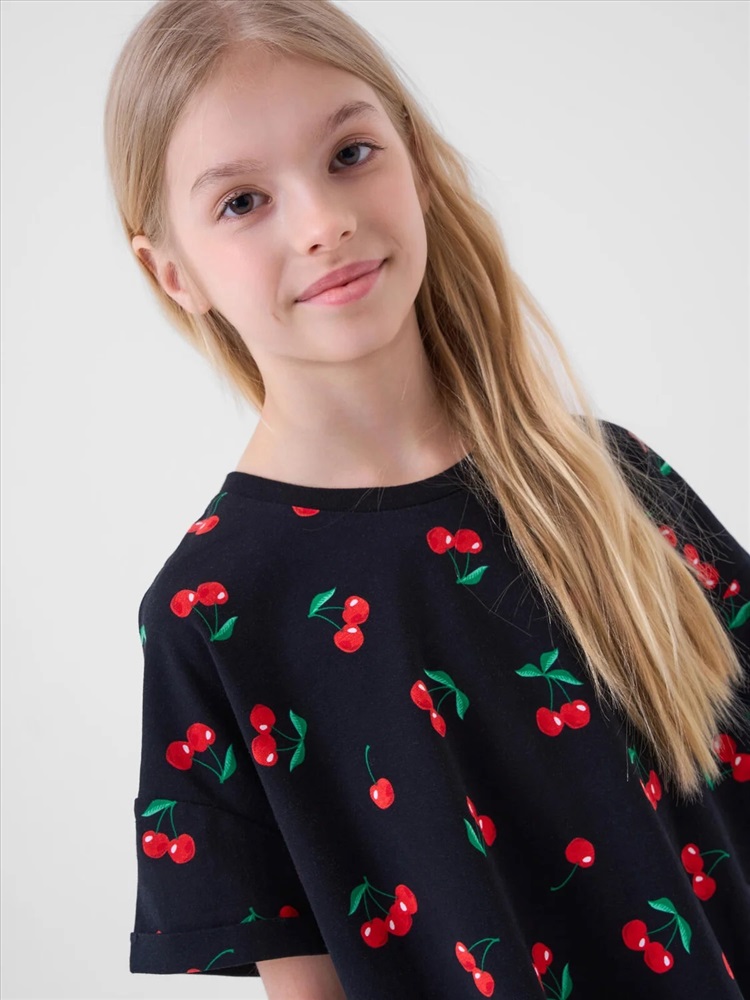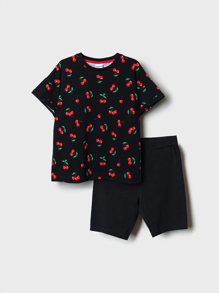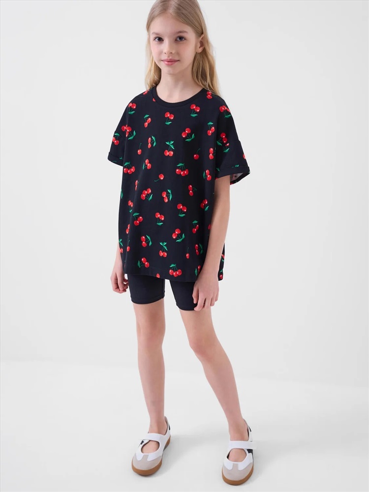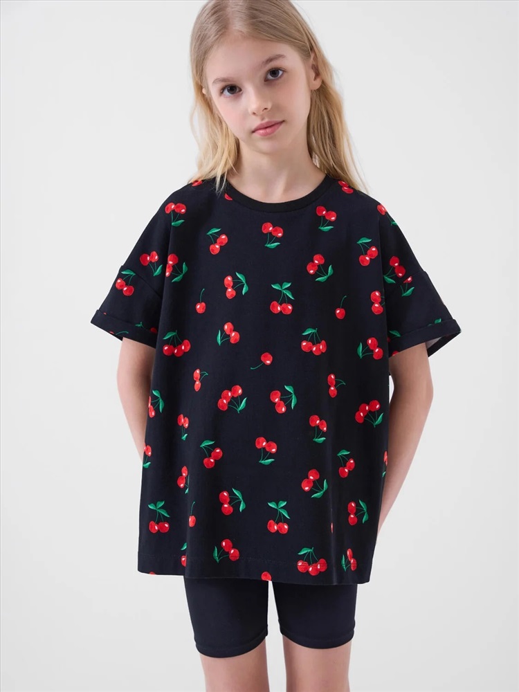 Российский размер: 128 Рост: 128 Возраст: 8 Обхват шеи: 29,5/28 Артикул поставщика: 12621574 Состав: 95% хлопок, 5% эластан Год: 2026 Комплект для девочки подростка. Состоит из оверсайз футболки с коротким рукавом и укороченных легинсов. Футболка выполнена из мягкого трикотажа с ярким принтом в виде вишен на чёрном фоне. Легинсы с высокой посадкой и комфортным эластичным поясом. Комментарии к товару