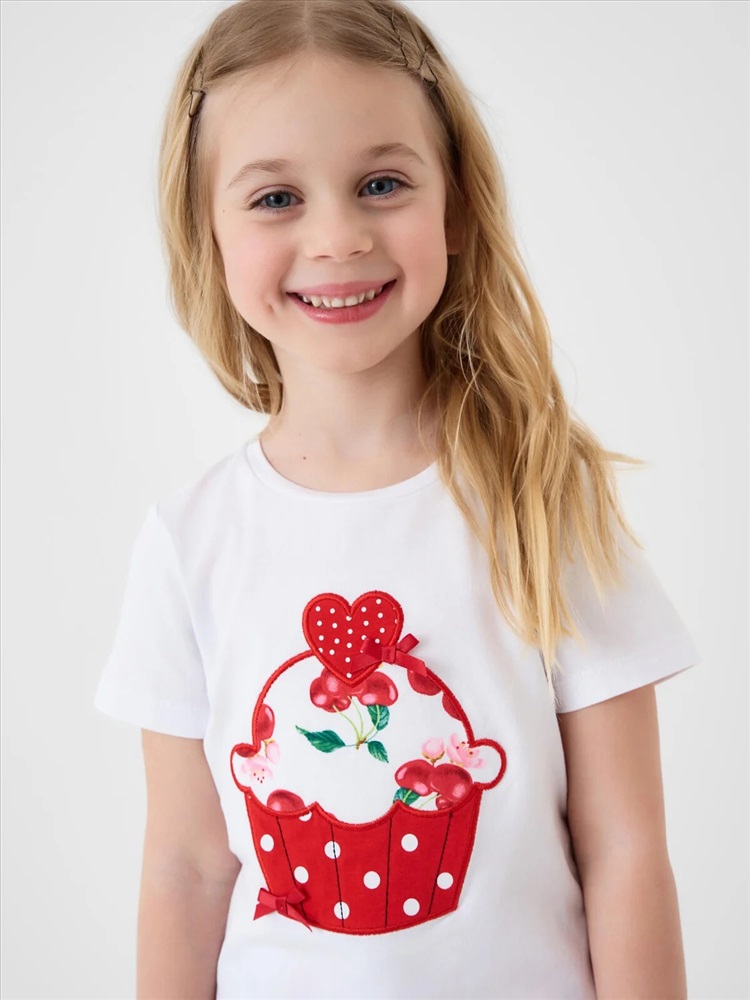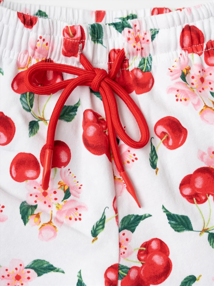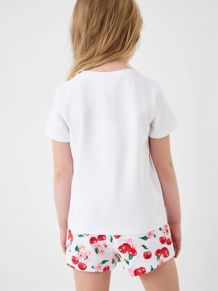 Детский костюм для девочки. Состоит из футболки с коротким рукавом и шорт. Выполнен из хлопкового трикотажа. Футболка прямого кроя, с красочным принтом и объемными бантиками. Шорты свободные, хорошо сидят на талии благодаря эластичному поясу и регулирующему шнурку. Удобные боковые карманы.