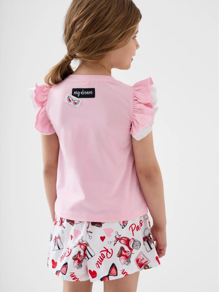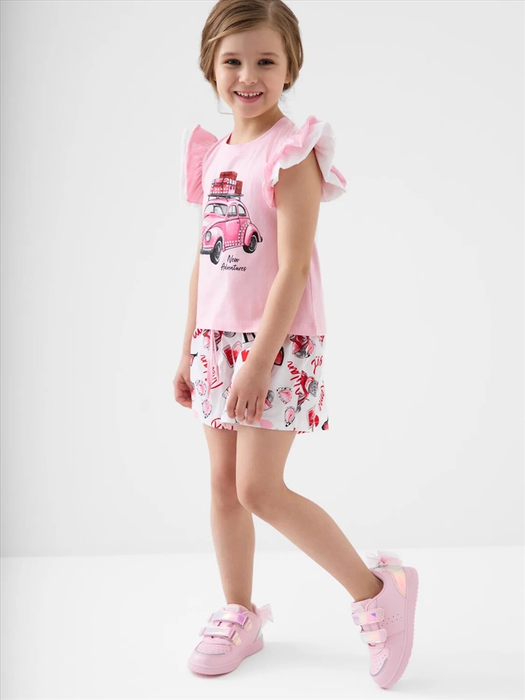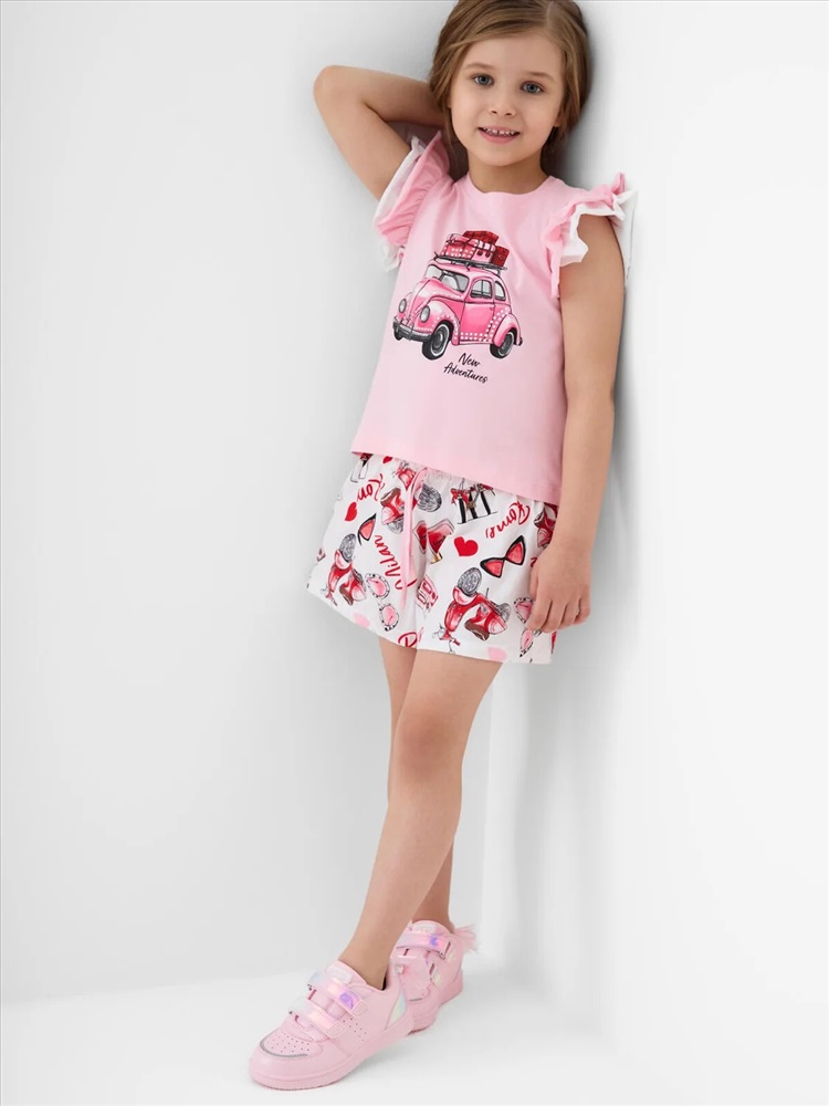 Российский размер: 98 Рост: 98 Возраст: 3 Обхват шеи: 25,5 Артикул поставщика: 12622403 Состав: Футболка- 95% хлопок, 5% эластан, Шорты- 100% хлопок Год: 2026 Легкий детский костюм для девочки. Состоит из футболки с коротким рукавом и шорт. Футболка прямого силуэта, выполнена из мягкого хлопкового трикотажа. Эффектные многослойные рукава с воланами, которые создают нарядный и лёгкий образ. На передней части расположен яркий принт, на спинке — аккуратная декоративная нашивка. Шорты выполнены из хлопковой ткани с ярким принтом. Посадка высокая, пояс на мягкой резинке дополнен декоративным шнурком. Есть удобные боковые карманы. Комментарии к товару