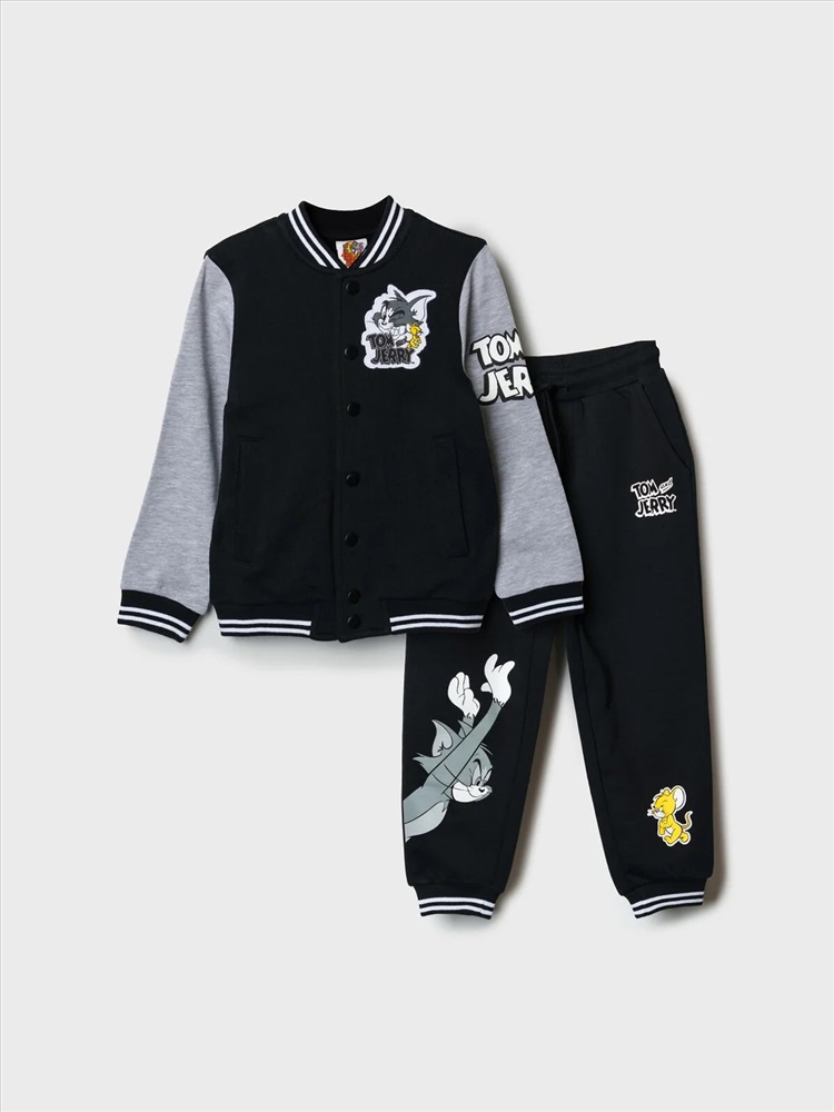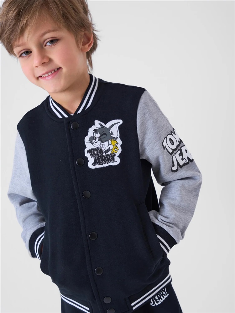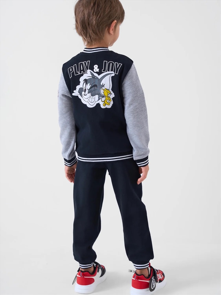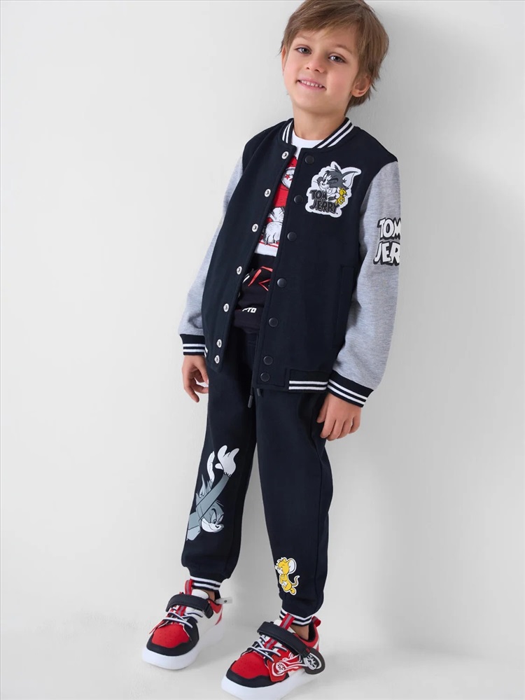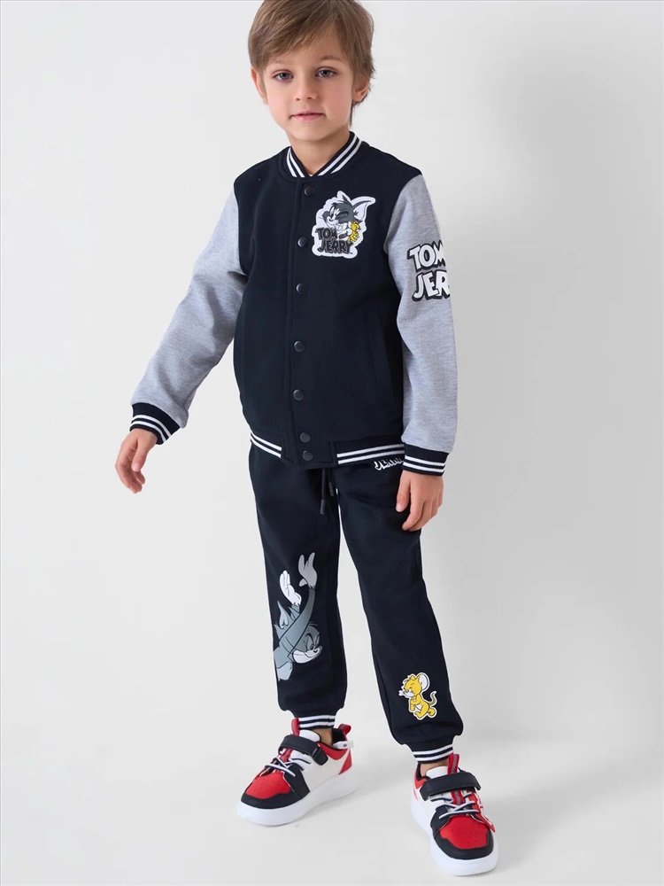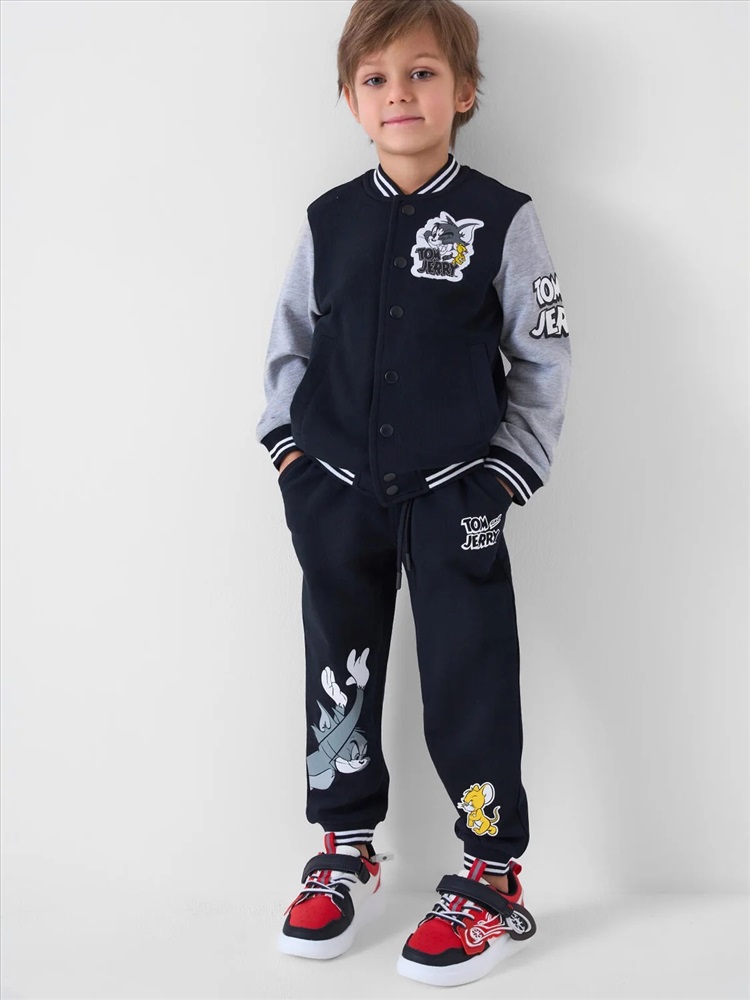 Детский спортивный костюм для мальчика. Комплект выполнен из хлопкового футера и состоит из толстовки на молнии и джогеров на резинке. Толстовка прямого кроя с красочным принтом любимых героев Том и Джерри. Боковые карманы. Манжеты и пояс выполнены из эластичного риба, благодаря чему изделие хорошо держит форму. Брюки джоггеры — комфортные, с эластичным поясом и шнуром для регулировки посадки. Удобные боковые карманы. Низ штанин собран на резинку.