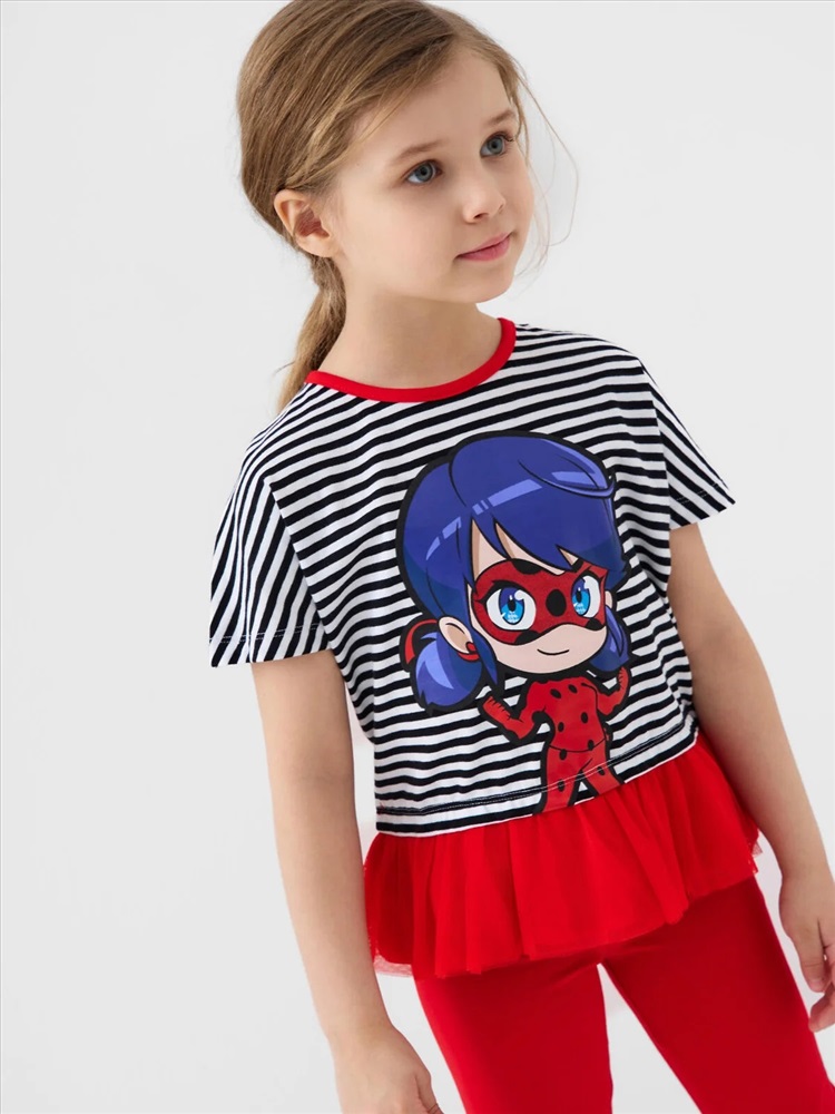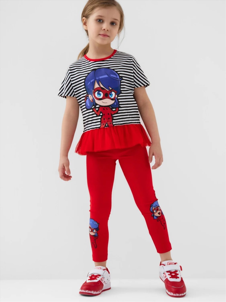 Российский размер: 98 Рост: 98 Возраст: 3 Обхват шеи: 25,5 Артикул поставщика: 12642001 Состав: 95% хлопок, 5% эластан Год: 2026 Летний детский комплект для девочки. Состоит из футболки с коротким рукавом и легинсов с принтом любимых мультяшных героев "Леди Баг и Супер-Кот". Футболка свободного кроя, выполнена из хлопкового трикотажа джерси и украшена оборкой из сетки. Леггинсы на резинке выполнены из хлопкового трикотажа джерси. Комментарии к товару