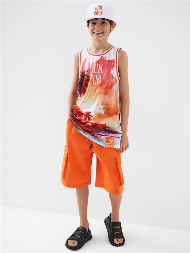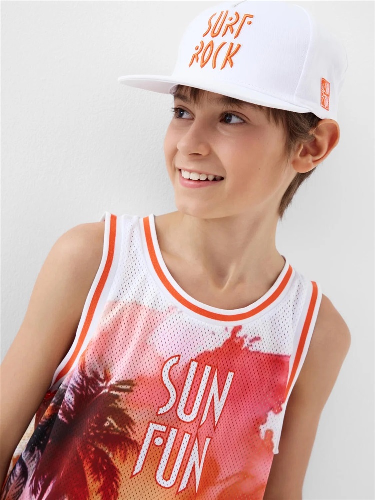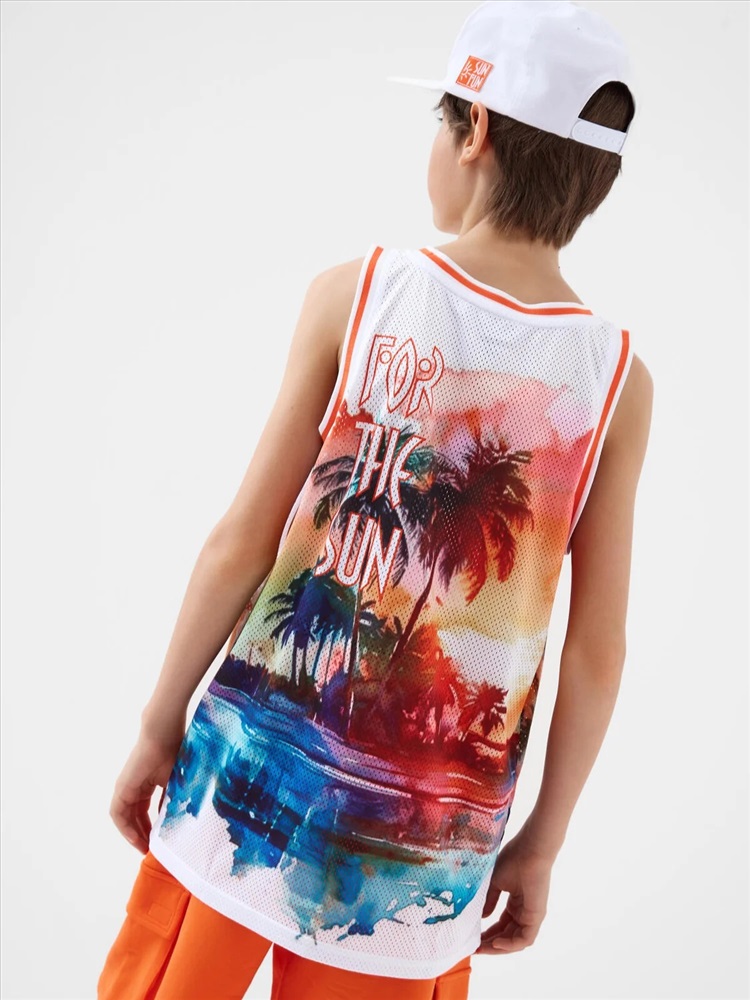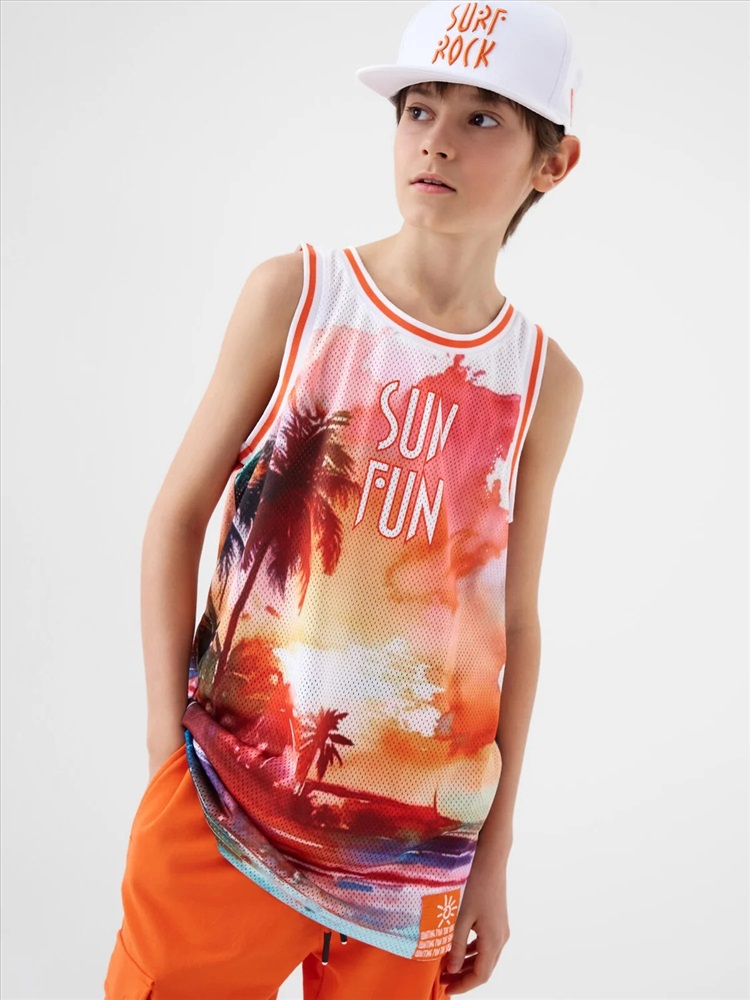 Российский размер: 146 Рост: 146 Возраст: 11 Обхват шеи: 32/31,1 Артикул поставщика: 12611362 Состав: сетка- 100% полиэстер Год: 2026 Майка для мальчика подростка. Модель прямого силуэта, без рукавов, с круглой горловиной. Выполнена из сетки. Спереди — крупный принт. Внизу — маленькая нашивка. Комментарии к товару