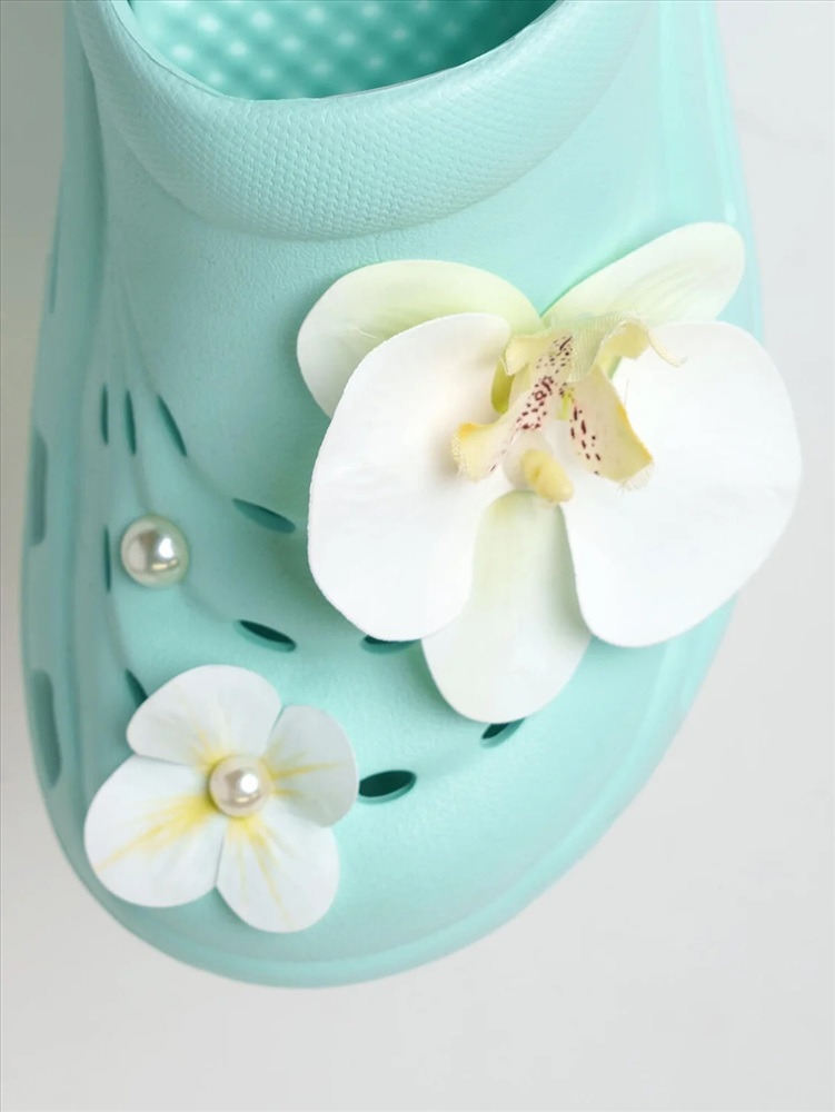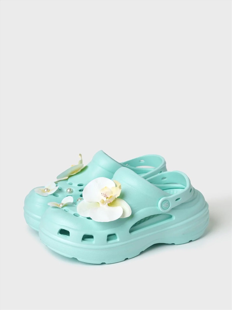 Сабо женские на высокой подошве. Модель выполнена из облегченного и прочного ЭВА. Материал хорошо моется. Форма модели учитывает эргономику стопы. Оригинальность модели придают большие съемные цветы-джибицы. Модель имеет перекидной ремешок фиксации ноги.