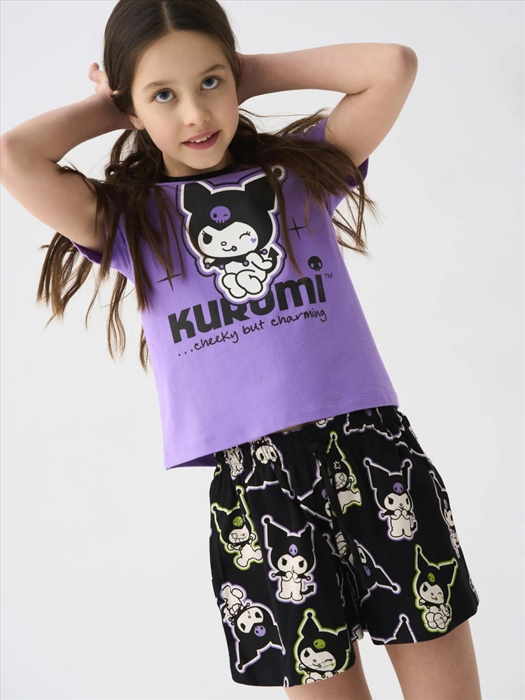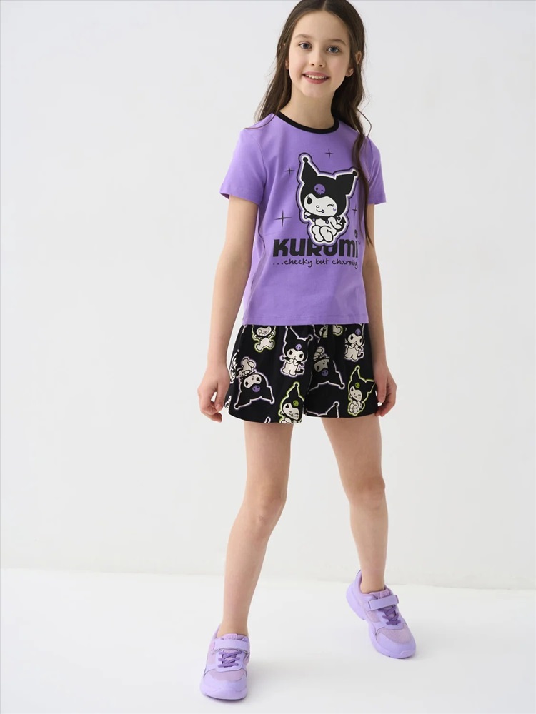 Российский размер: 122 Рост: 122 Возраст: 7 Обхват шеи: 28,4/27 Артикул поставщика: 12641023 Состав: 95% хлопок, 5% эластан Год: 2026 Шорты для девочки подростка. Модель свободного кроя из мягкого, хлопкового трикотажа джерси. Удобная посадка обеспечивается эластичным поясом со шнуром. Спереди — боковые карманы. Дизайн выполнен с любимым мультяшным героем Куроми. Комментарии к товару
