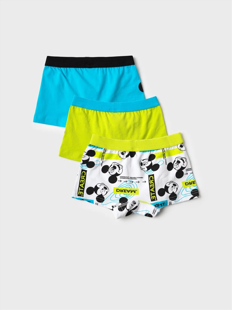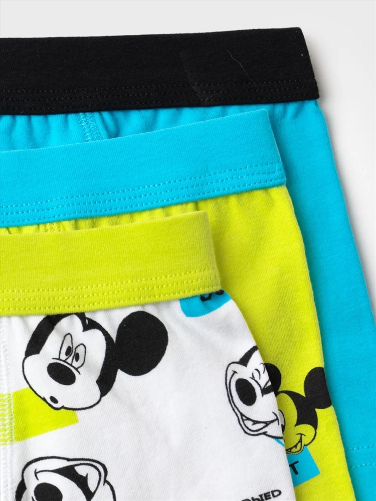 Набор из трех детских трусов-боксеров для мальчика. Изделие плотно прилегает к телу, не имеет боковых швов, что делает его особенно комфортным. Эластичный пояс с логотипом бренда обеспечивает надёжную посадку. Принт с любимым мультяшным героем - Микки Маус. Материал — мягкий хлопковый трикотаж, приятный к телу.