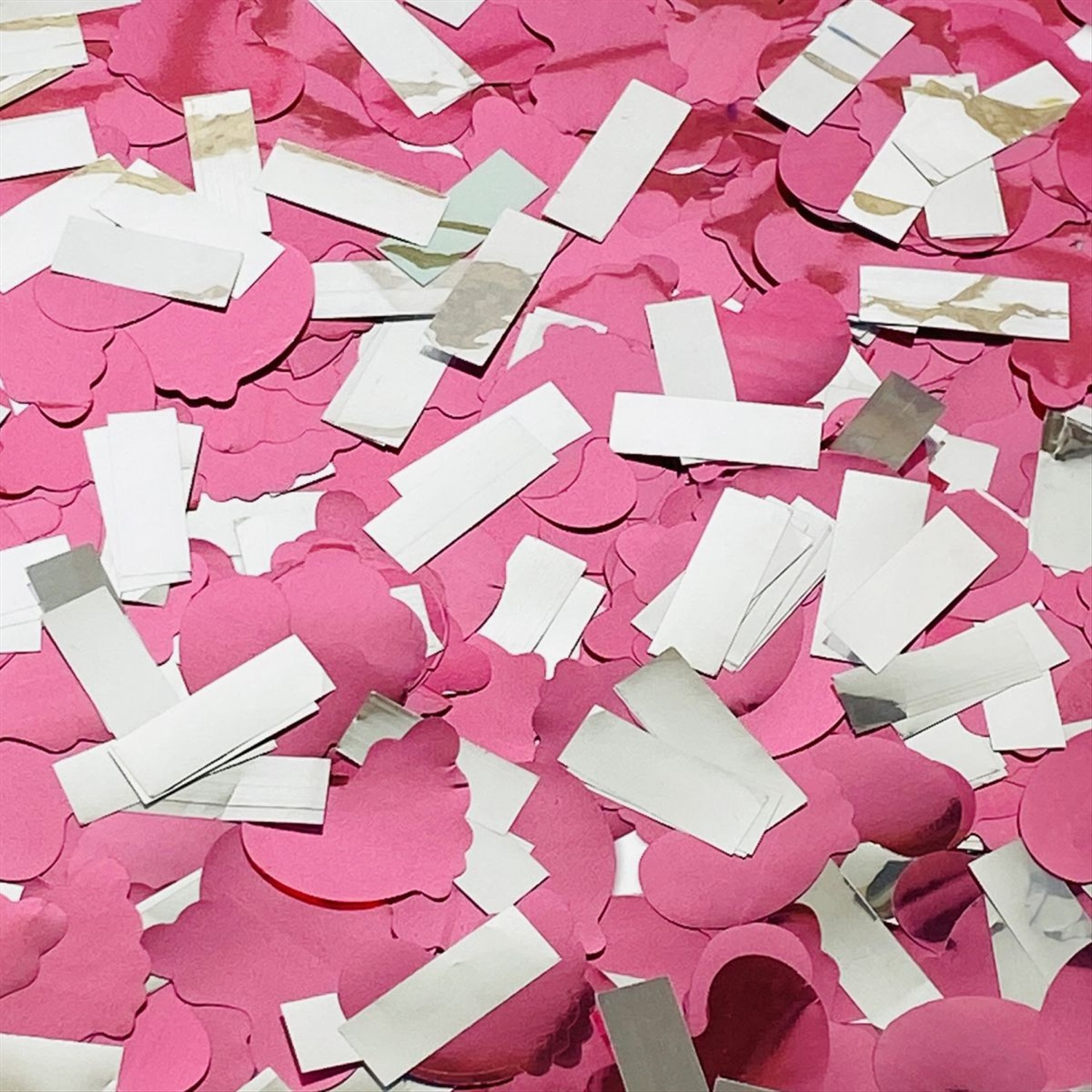 1. Хлопок. 2. Выброс наполнителя (конфетти розовое, конфетти серебряное).