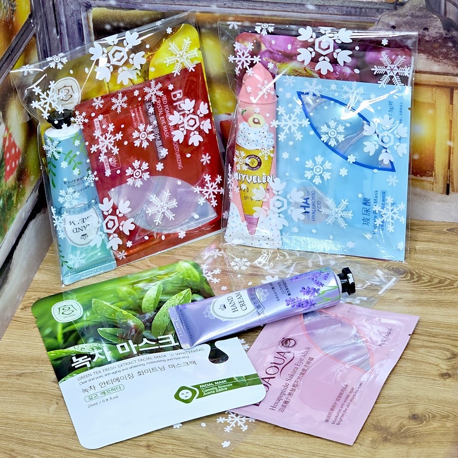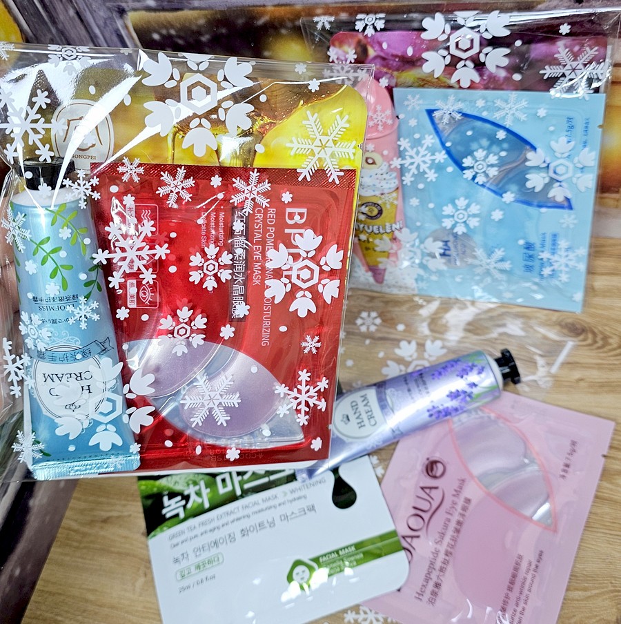 В состав набора входят: 1. Маска для лица (Случайный вид из имеющихся на складе) 2. Крем для рук 30 гр. (Случайный вид из имеющихся на складе) 3. Патчи для глаз 1 пара (Случайный вид из имеющихся на складе) 4. Подарочный пакет со снежинками заклеивающийся Комментарии к товару