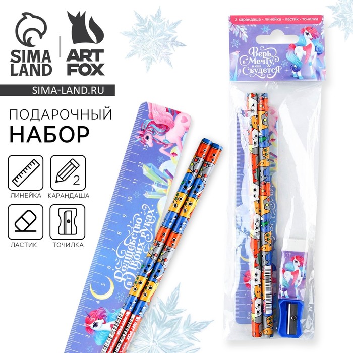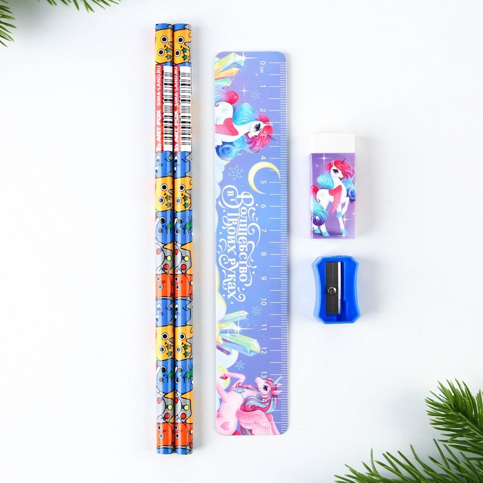 Производитель: ArtFox; Габариты: 7 x 23 x 1; Страна: Китай; В боксе: 300 набор; Состав: Дерево, картон, металл, пластик, резина, графит; Материалы: дерево, картон, металл, пластик, резина, графит; Фасовка: по 1 набор; Индивидуальная упаковка: Клапан, пакет; Габариты товара: 22 см × 7 см × 1,5 см; Сертификат: ЕАС; Для кого: Для девочки; В наборе, шт.: 5; Вид упаковки: Пакет с клапаном; Символ года: Нет; Тематика праздника: Новый год; Адресат: Без адресата; Материал: Каучук, Дерево, Картон, Пластик; Составляющие набора: Линейка, Карандаши, Точилка, Ластик; Возраст: Для детей; Стиль: Шебби-шик; Фиксированная цена: Да