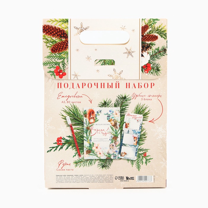 Производитель: ArtFox; Габариты: 3 x 17 x 24; Доставка: Платная; Страна: Россия; В боксе: 72 набор; Состав: См. на упаковке; Материалы: см. на упаковке; Фасовка: по 1 набор; Индивидуальная упаковка: Плёнка; Сертификат: Не подлежит сертификации; Для кого: Унисекс; Формат: А5; Линовка блока: Линейка; В наборе, шт.: 3; Вид упаковки: Коробка картонная, Плёнка; Рисунок: Да; Символ года: Нет; Тематика праздника: Новый год; Адресат: Без адресата; Материал: Картон, Пластик, Бумага; Тип ежедневника: Недатированный; Составляющие набора: Стикеры, Ручка, Ежедневник; Возраст: Для детей; Дизайн обложки: С рисунком