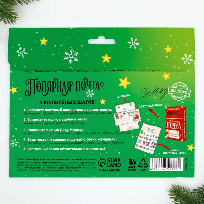 Производитель: ArtFox; Габариты: 0,1 x 25 x 20; Страна: Россия; В боксе: 300 набор; Состав: Бумага, картон; Материалы: бумага, картон; Фасовка: по 1 набор; Индивидуальная упаковка: Плёнка; Сертификат: ЕАС; В наборе, шт.: 6; Отделка: Без отделки; Вид упаковки: Плёнка; Символ года: Нет; Тематика праздника: Новый год; Материал: Бумага; Составляющие набора: Наклейки, Письмо Деду Морозу, Ящик; Особенности письма: С конвертом; Формат письма: А5