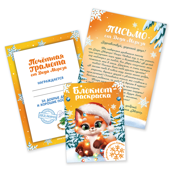 Производитель: ArtFox; Габариты: 0,3 x 14 x 20; Страна: Россия; В боксе: 650 набор; Состав: Бумага; Материалы: бумага; Фасовка: по 1 набор; Индивидуальная упаковка: Пакет; Сертификат: ЕАС; Для кого: Унисекс; В наборе, шт.: 3; Отделка: Без отделки; Вид упаковки: Пакет; Символ года: Нет; Тематика праздника: Новый год; Адресат: Без адресата; Материал: Бумага; Составляющие набора: Грамота, Письмо от деда мороза, Блокнот; Возраст: Для детей; Особенности письма: С раскраской; Формат письма: А5