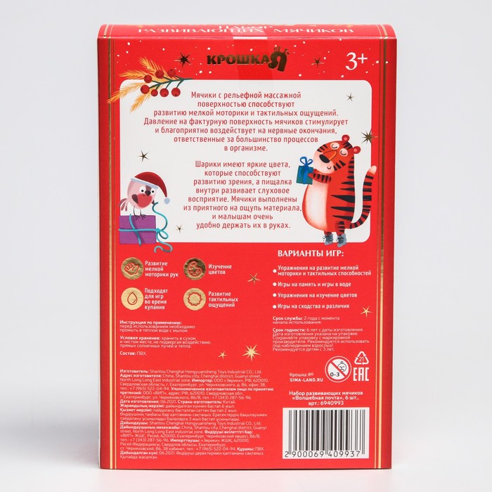 Производитель: Крошка Я; Габариты: 13 x 20 x 6,5; Страна: Китай; В боксе: 48 набор; В наборе: 6 набор; Состав: ПВХ; Материалы: ПВХ; Фасовка: по 1 набор; Индивидуальная упаковка: Цветная картонная коробка; Сертификат: ЕАС; Набор: Да; Цвет: Разноцветный; Для кого: Унисекс; Диаметр, см: 6; Возраст: От 3 лет; В наборе, шт.: 6; Тематика праздника: Новый год; Адресат: Малышу/Малышке/Новорождённому; Материал: ПВХ; Развитие навыков: Фигуры, цвета, Моторика; Дополнительные функции: Развивающая, Плавающая; Составляющие набора: Тактильные мячики; Возраст: Для детей; Фиксированная цена: Да
