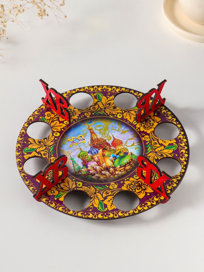 Эта пасхальная подставка для яиц превращает праздничный стол в произведение искусства. Восемь ячеек для крашенок венчает изящная модель собора, расписанная в традициях хохломы. Она создаёт на столе тёплую, праздничную атмосферу и становится центром пасхальной композиции.