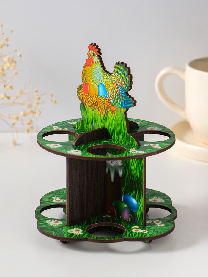 Эта двухъярусная подставка для пасхальных яиц станет ярким акцентом праздничного стола. Изделие в виде курочки не только красиво, но и функционально: оно компактно размещает восемь яиц, экономя место и создавая эффектную композицию. Устойчивая конструкция из прочного ХДФ с интересным изображением передаёт атмосферу весеннего праздника.