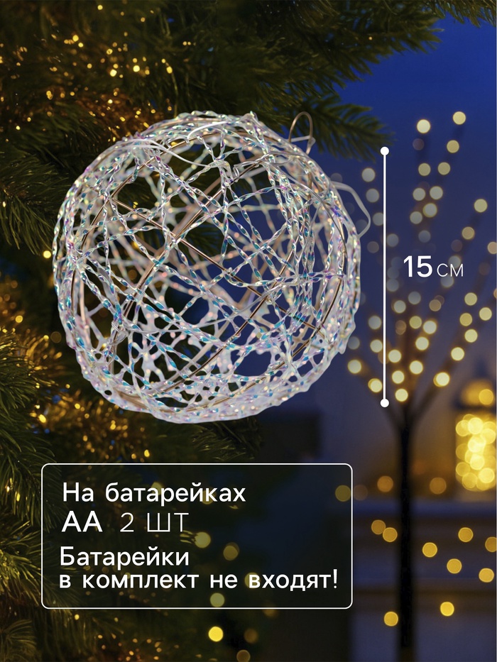 Производитель: Luazon Lighting; Габариты: 15 x 15 x 15; Страна: Китай; В боксе: 24 шт; Состав: Металл, пластик; Материалы: металл, пластик; Фасовка: по 1 шт; Индивидуальная упаковка: Пакет; Габариты товара: 15 см × 15 см × 15 см; Сертификат: Не подлежит сертификации; Цвет свечения: Тёплый белый; Набор: Нет; Цвет: Золотистый; Высота, см: 15; Количество батареек: 2; Гарантийный срок, мес.: 6; Количество светодиодов: 15; Диаметр шара, см: 15; Символ года: Нет; Тематика праздника: Новый год; Материал: Металл; Типоразмер батареек: AA (LR6); Материал: Пластик; Тип питания: От батареек; Стиль: Скандинавский