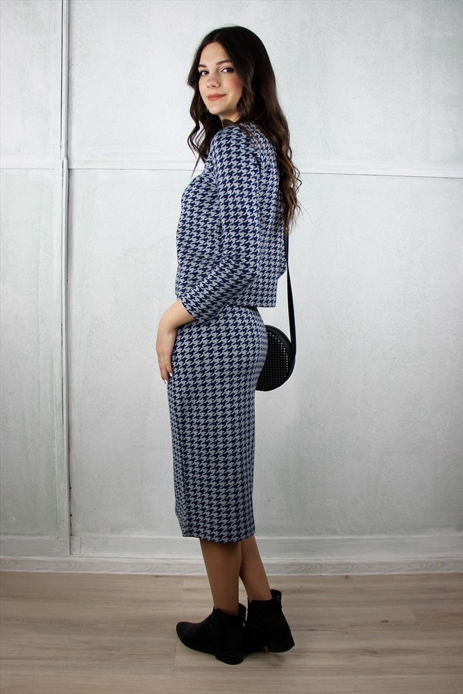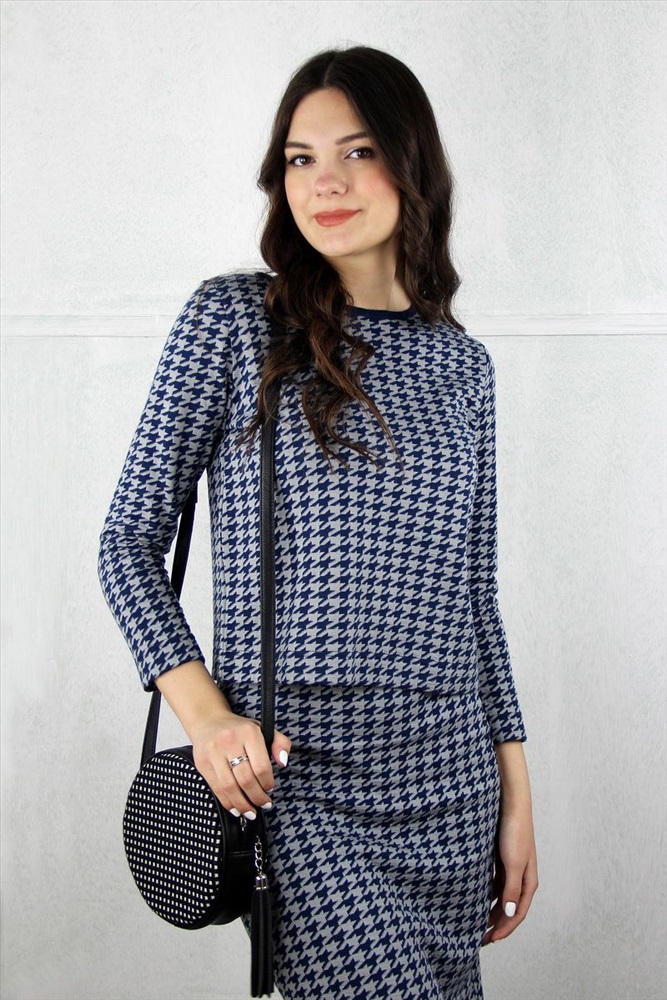 Комплект женский,второго слоя одежды. Джемпер прямого силуэта(слегка заужен к низу) рукав 7/8,низ стана и рукавов с широким подгибом 4см .Круглый вырез головины обработан бейкой - сдвоенная кулирная гладь,высотой 1,2+/- 0,5 см. Юбка женская прямого силуэта(немного заужена) ,верх юбки напритачной ластичной тесьме наружу,низ с широким подгибом 4 см.