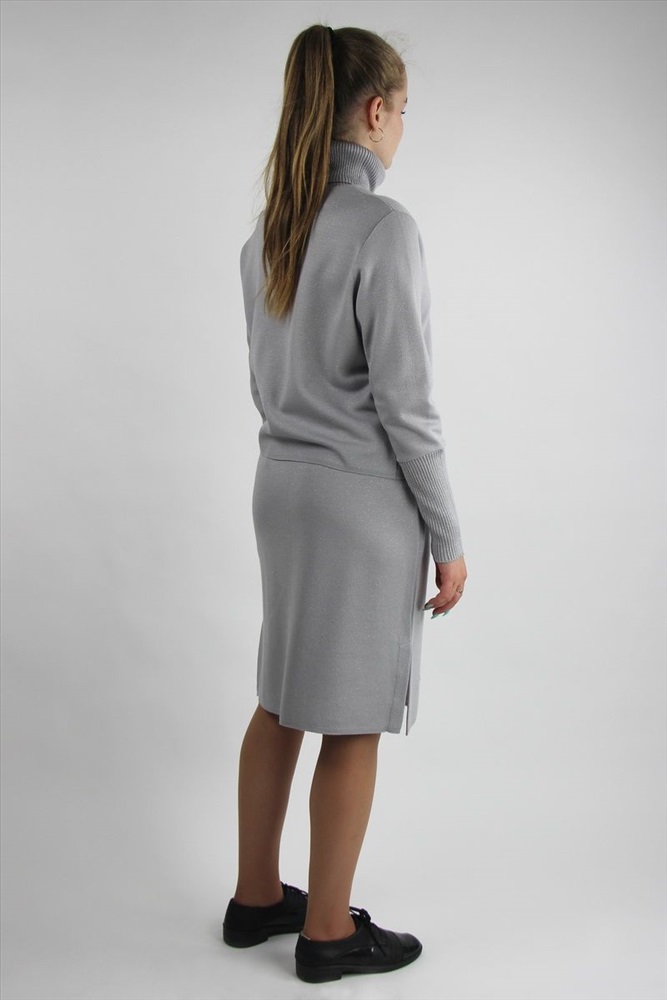 Страна производитель: Республика Беларусь Комплектация: Юбка, Свитер Сезон: Демисезон Коллекция: Осень-Зима Стиль: На каждый день Цвет: ангора Материал: трикотаж, вязаное Рост: 164, 158 см Состав: пан 100% Описание: Комплект второго слоя. Состоит из свитера и юбки. Свитер укороченный прямого силуэта с длинным втачным рукавом с притачными ластичными манжетами, круглым вырезом горловины, обработанным отложным воротником. Низ стана заработан сдв. кул . гладью 1+-0,3 см. Юбка прямого силуэта с разрезами по бокам.На задней детали юбки талевые вытачки. Верхний срез обработан эластичной резиновой тесьмой шириной 4см. Низ юбки зарабан сдвоенной кулирной гладью 1,0см+0,2см. Комментарии к товару