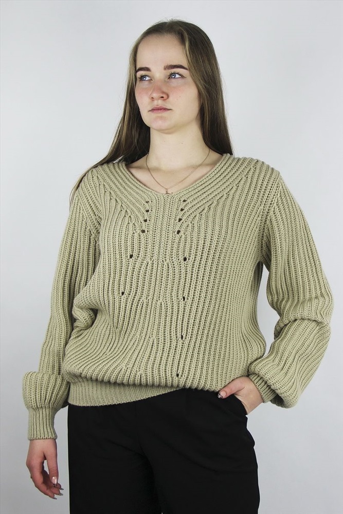 Джемпер женский, второго слоя одежды, регулярный, прямого силуэта, с длинным втачным рукавом. V-образный вырез горловины и росток - регулярные. Заработок стана и рукава - ластик 1х1, высотой в г.в. 6,0см.