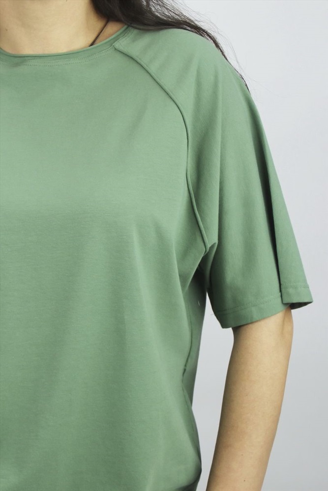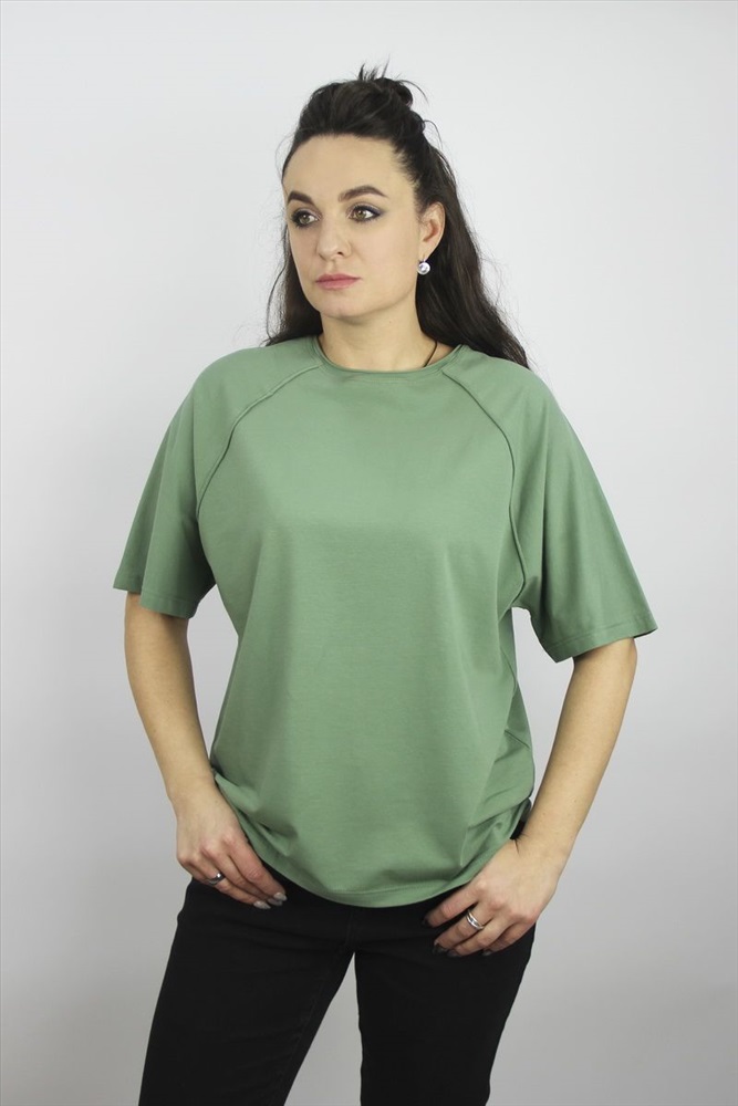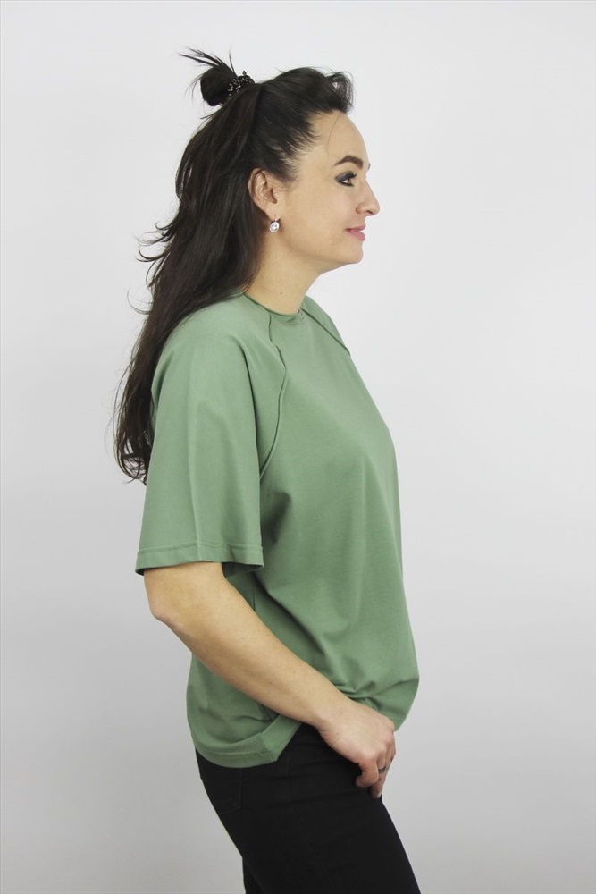 Джемпер второго слоя ожежды, прямого силуэта, со свободным коротким рукавом, цельнокроеным со спинкой. На деталь переда рукав настрочен с открытым срезом. Горловина обработана одинарной, притачной бейкой, с прокладыванием по шву отделочной строчки на спецмашине. Низ стана и рукава - с подгибом.